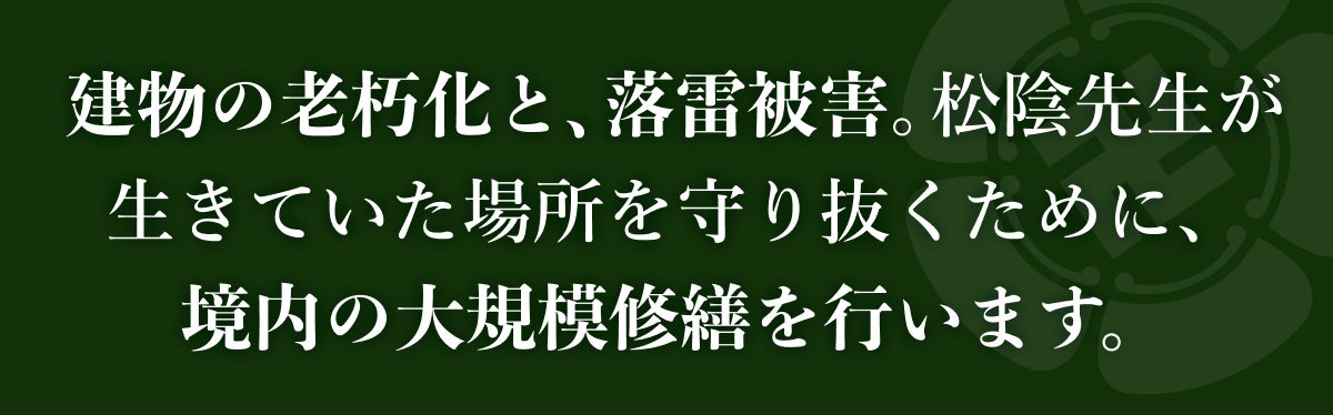 また当神社のある地区では、近年落雷による被害が相次いでいます。当神社もここ7年で4回被害に遭いました。松下村塾などを守るための防火・防犯設備が何度も破損し、そのたびに多額の費用をかけて復旧しています。これらが要因で、建物の維持管理費が捻出できないまま劣化が進んでしまった、というのも大規模修繕が必要となった背景の一つです。