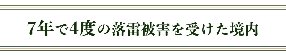 落雷の被害を受けた松の木です。立派な幹が大きくえぐれている様子から衝撃の強さが伝わってきます。幸い火災には至りませんでしたが、もし出火していたら、木ではなく建物に落ちていたらと考えると、とても恐ろしいです。このまま対策を講じず5度目の落雷被害に遭わないためにも、皆様のお力を借りて避雷針を設置したいと考えています。