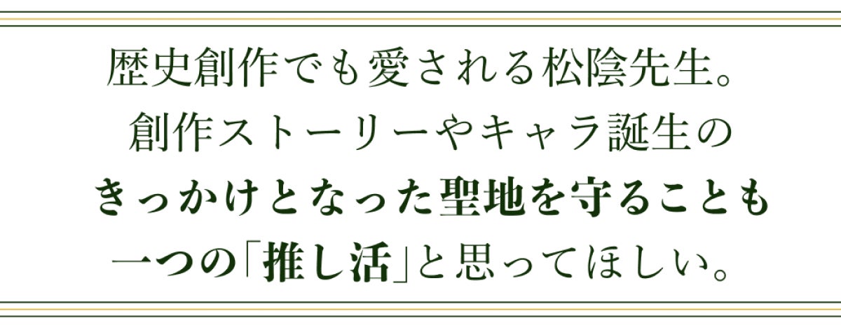 「幕末や歴史が好き」「吉田松陰を尊敬している」など、きっかけは違えど訪れた方々が境内を歩きながら松陰先生に想いを馳せる姿を見るのはとても喜ばしいことです。漫画やアニメ、ゲームがきっかけの方々も、吉田松陰がいたからこそ好きなキャラクターとの出会いがあったのだと感じていただけると嬉しいです。「推し」が生きた場所、「推し」のモデルとなった場所としてこの聖地を大切に思い、一緒に守ってくださることはとても素敵な「推し活」と言えます。皆さんのサポートが神社を守る大きな力となります。