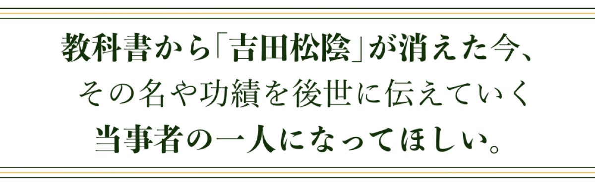 吉田松陰先生をはじめ、松下村塾の塾生の面々が歩んだ旧松本村の道が、現在では松門神社参道として、また「学びの道」としてご参詣の方々に親しまれている事をこの上なく喜ばしく感じておりますとともに、松陰先生のお言葉が全国の皆様の心へ届き、本企画を通してご賛同の輪が広がっていくことを願ってやみません。