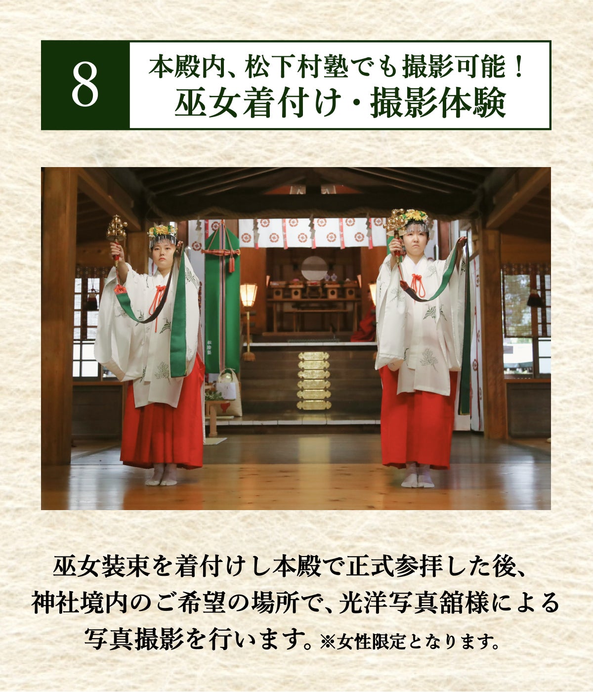 ・撮影場所:神社境内(本殿内、松下村塾、史跡内での撮影も可能)