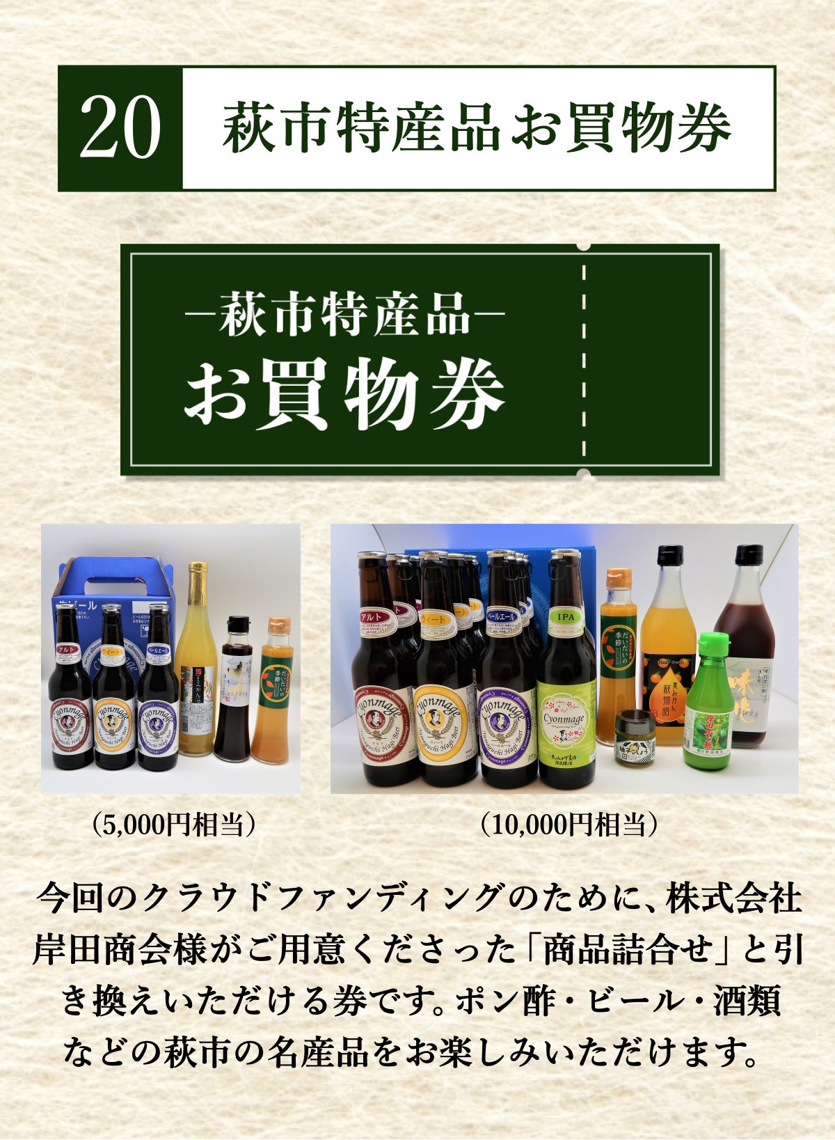 プロジェクト終了後、萩市特産品お買物券を発送いたします。商品は後日、通信販売酒類小売業免許を有する岸田商会様から直送します。
