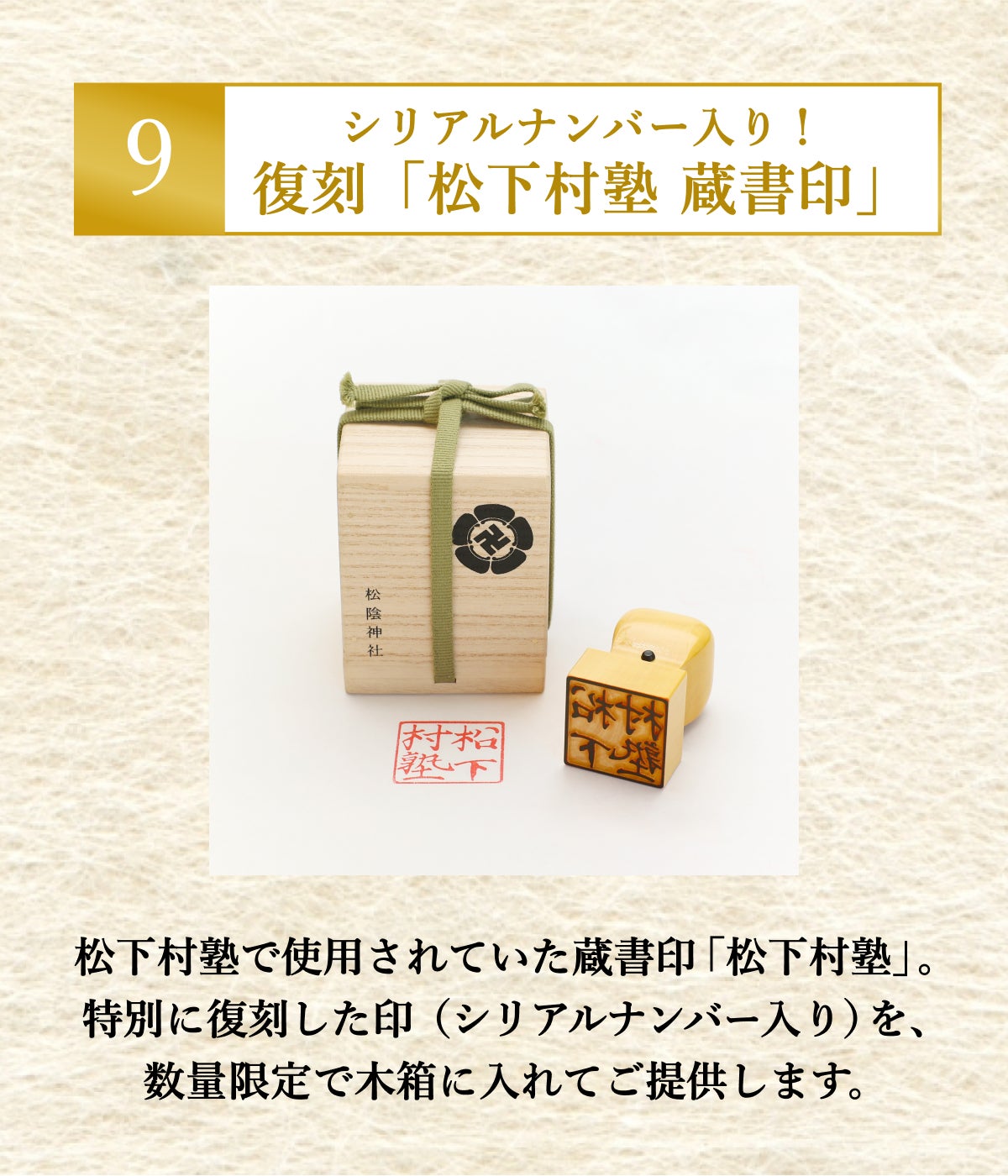 松下村塾で使用されていた蔵書印「松下村塾」を復刻した印(シリアルナンバー入り)を、木箱に入れてご提供します。