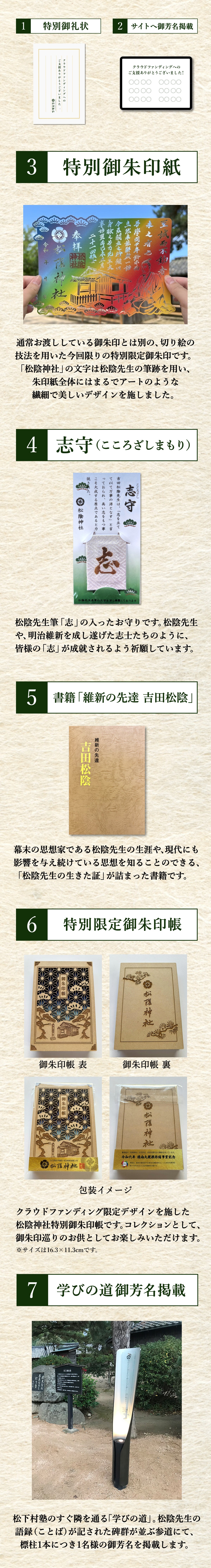 人気の御朱印や、御祭神の松陰先生にちなんだ「書籍」「御守」などの頒布品をセットにしました。「復刻 蔵書印コース」は10名様限定のため完売前お早めのご支援をおすすめいたします。