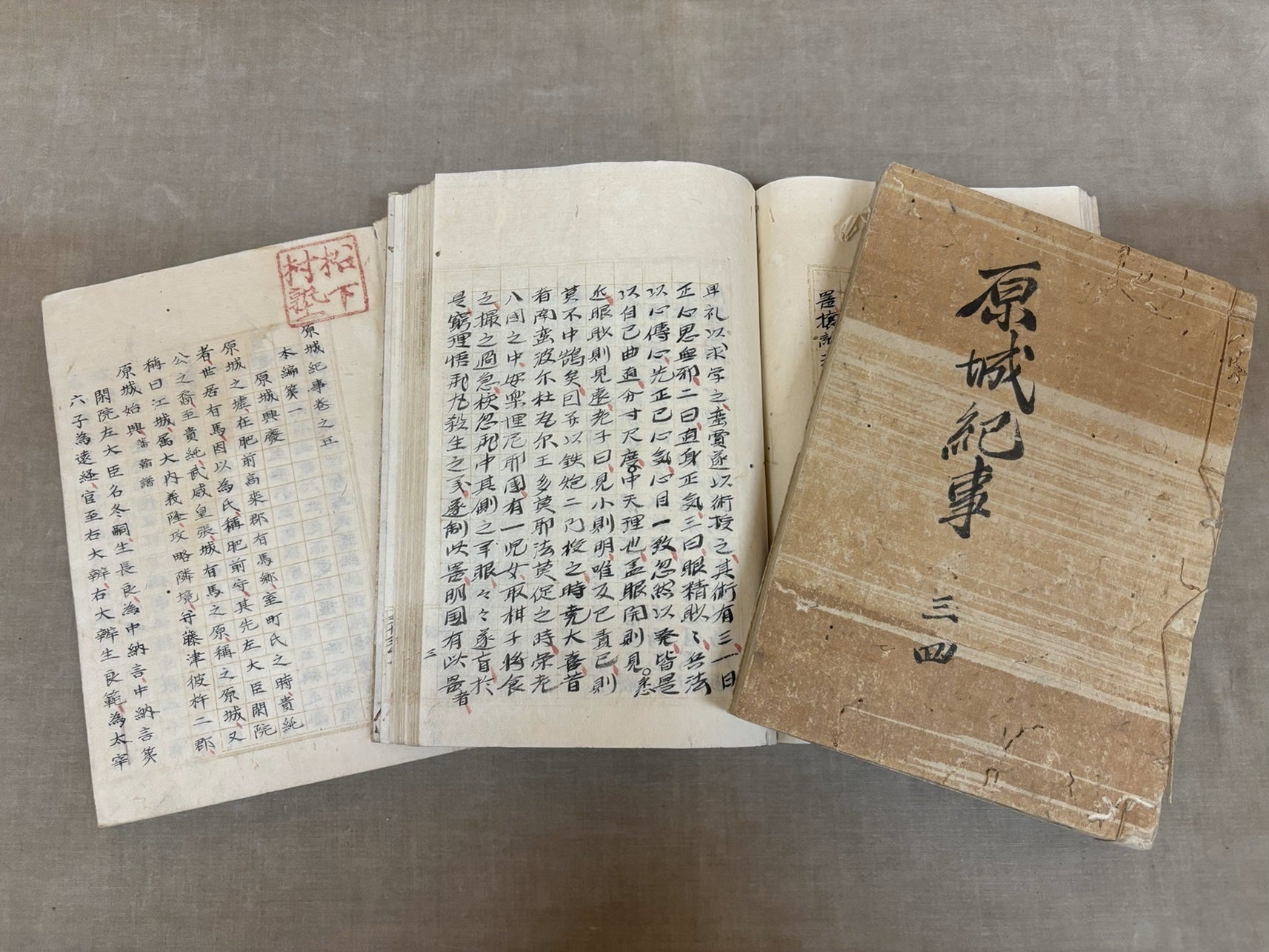 ↑の写真は当神社に所蔵されている宝物「原城紀事」です。江戸時代にあった「島原の乱」について書かれた本で、松陰先生を含む数名が手分けして写本したものです。表紙タイトルと写真中央の文章は松陰先生の筆跡です。
