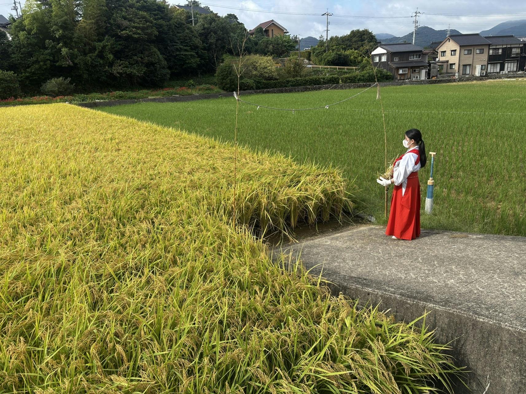 本プロジェクト募集終了からひと月、だいぶ秋めいてまいりましたね。当神社では先日、斎田の清祓と刈初めをご奉仕しました。早乙女は当社の巫女さんが務めました。
