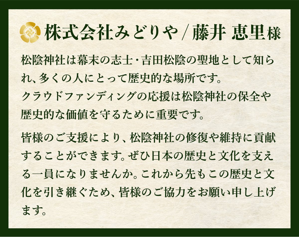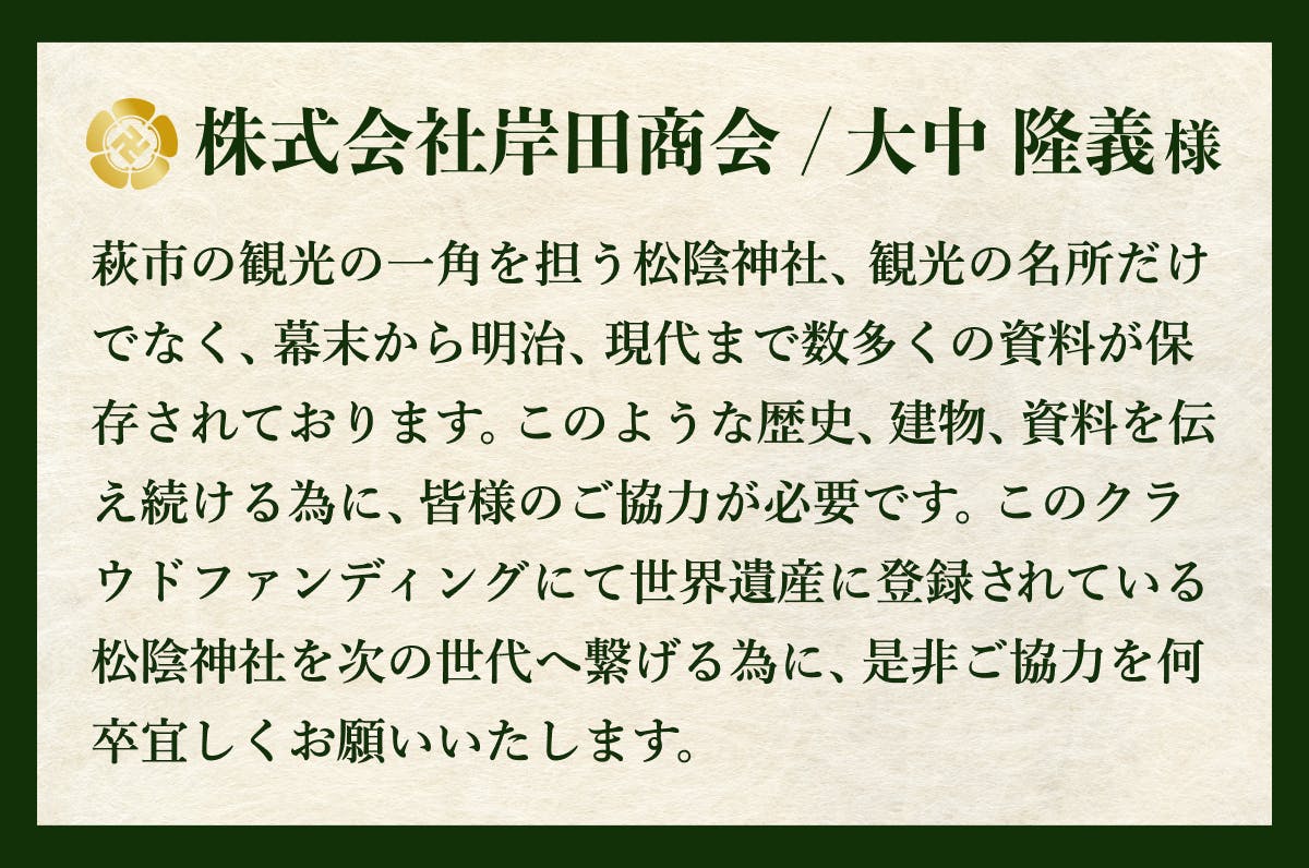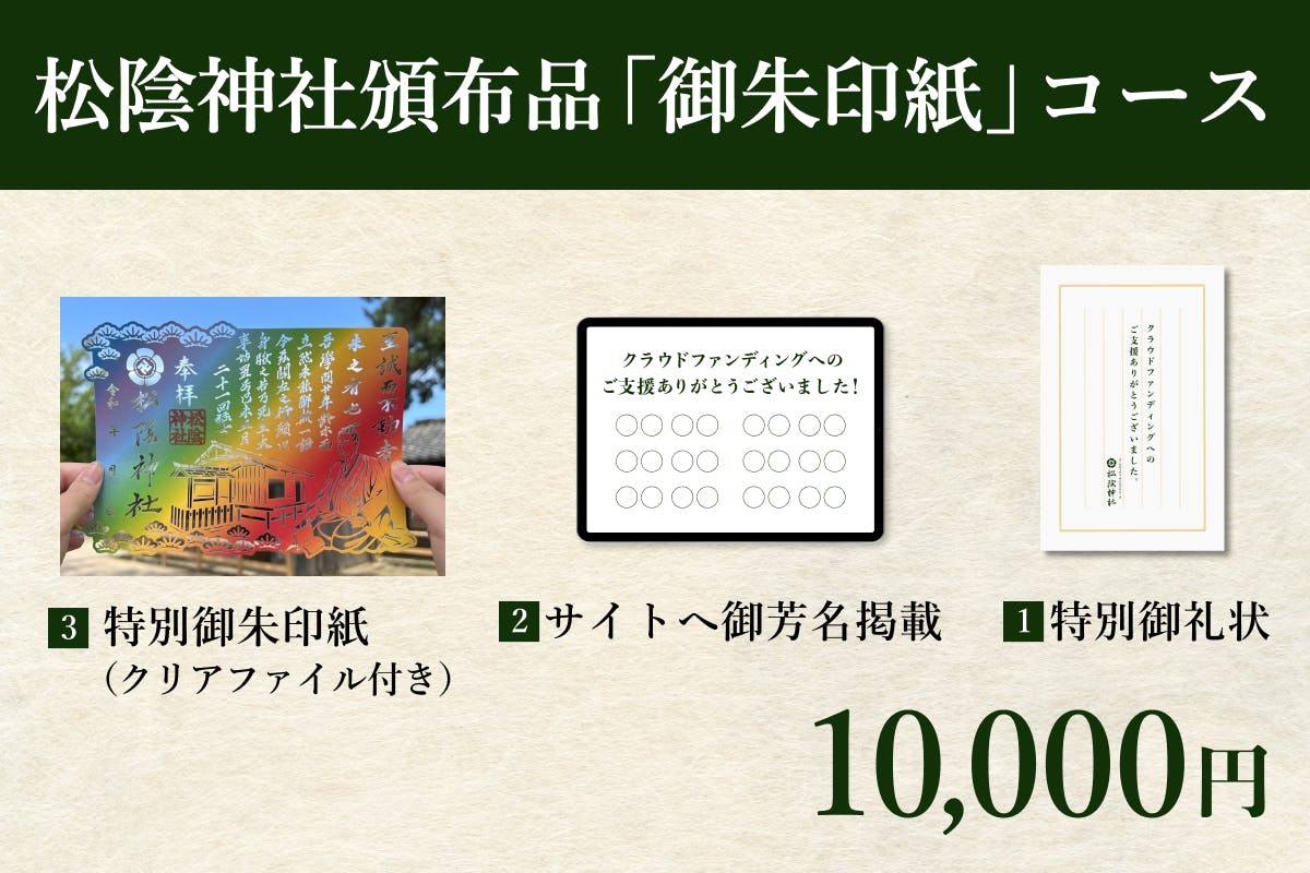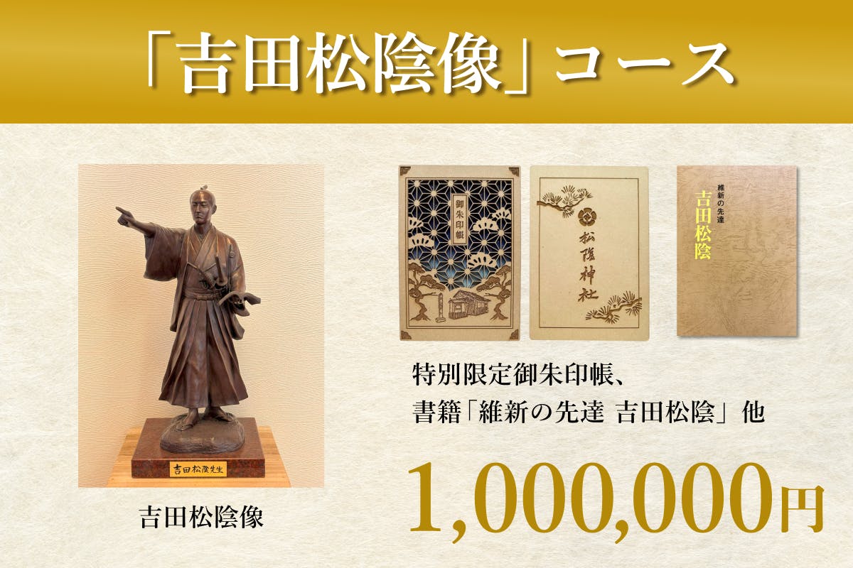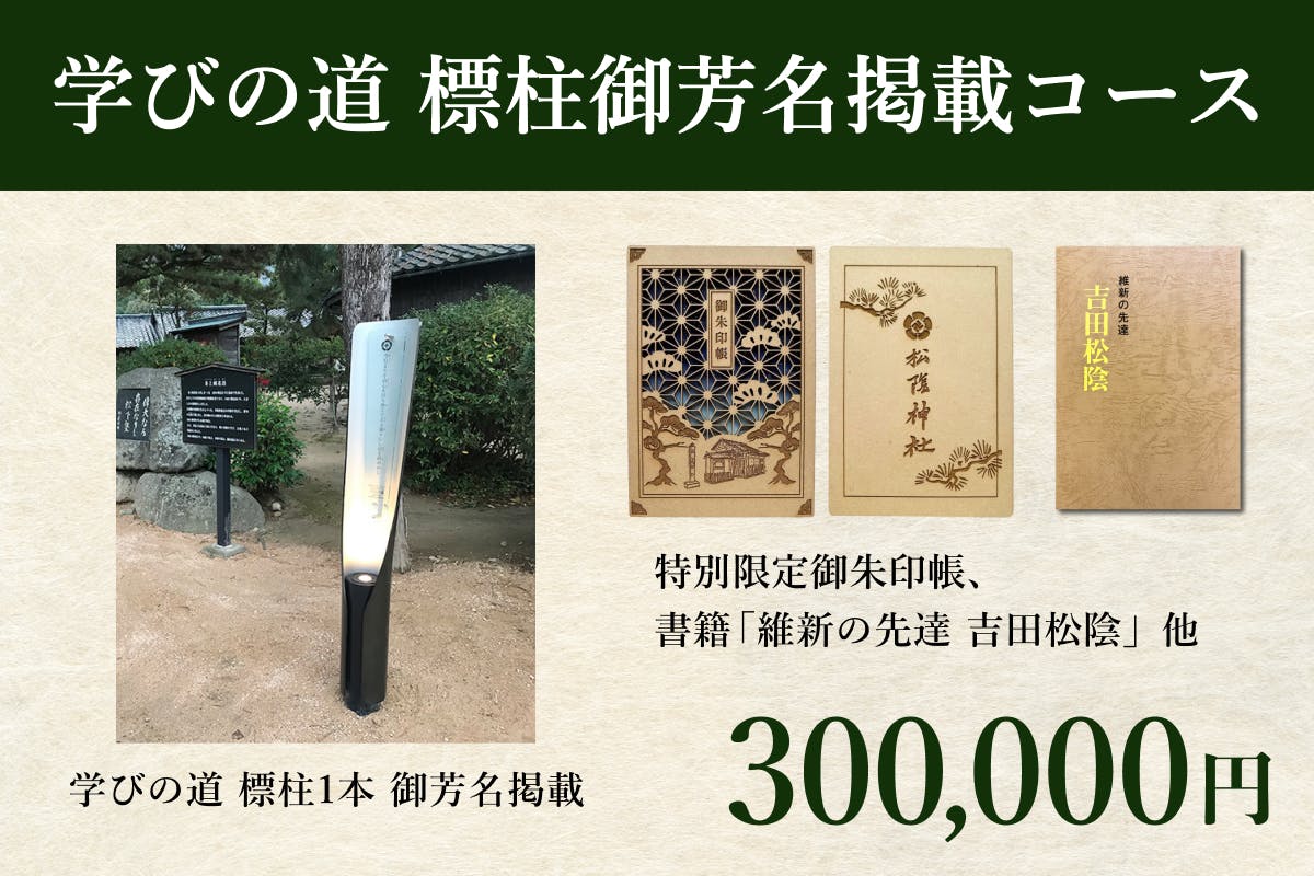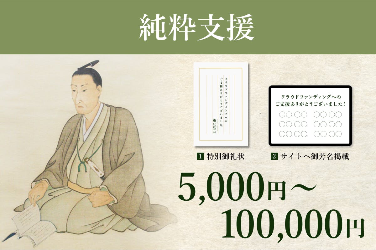 純粋にプロジェクトを応援してくださる方向けのコースです。物品の返礼品がない代わりに、松陰神社を後世に伝える一員としてサイトへの御芳名掲載と、後日特別御礼状をお送りします。