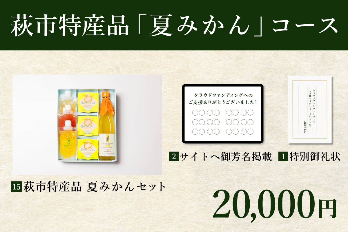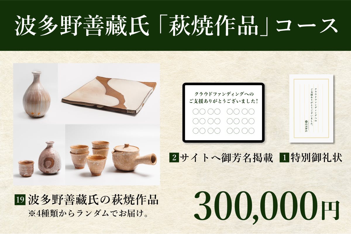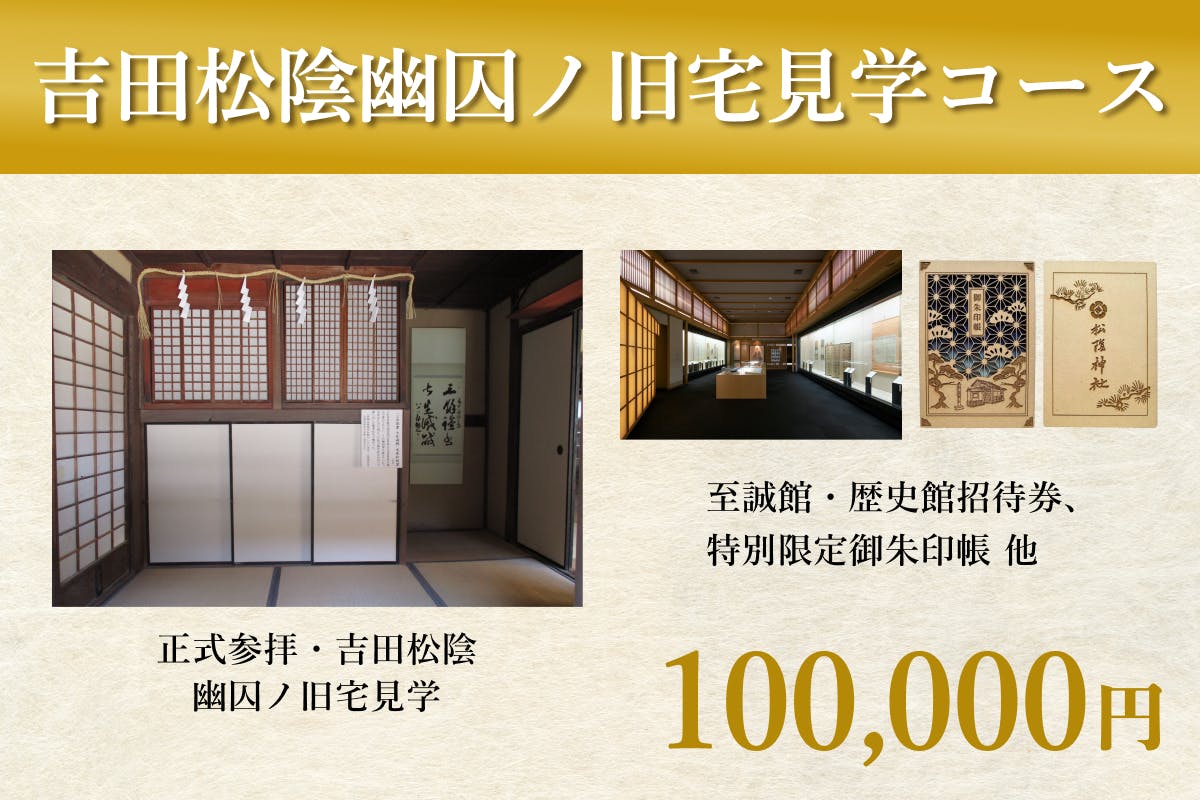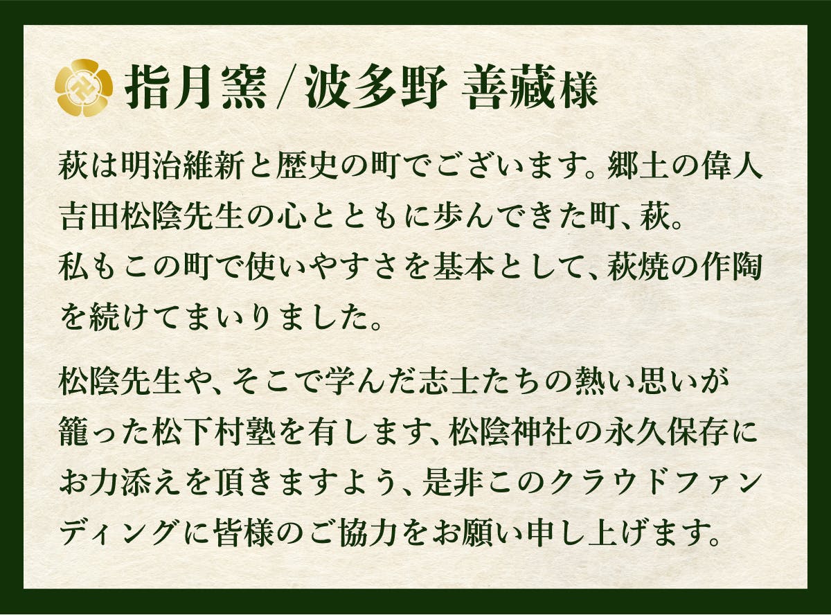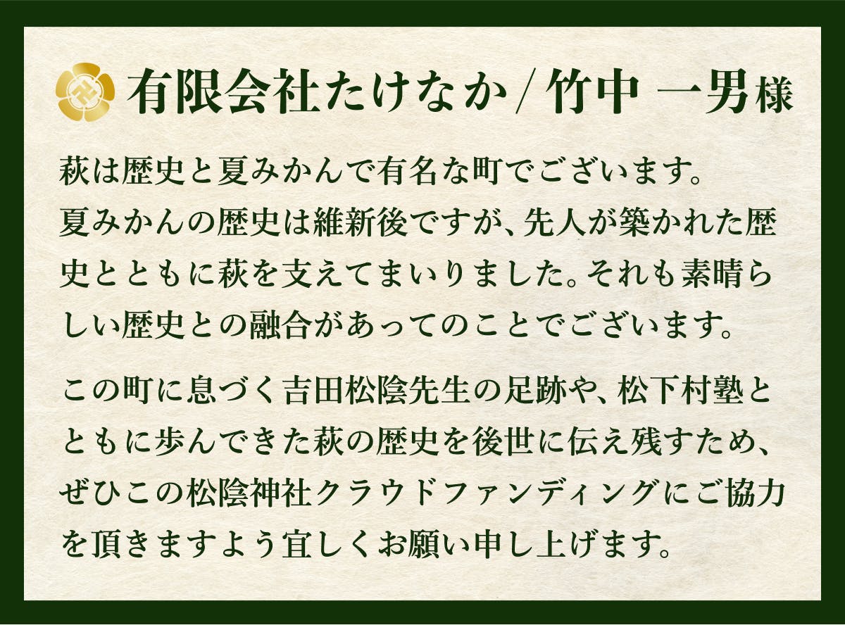 純粋にプロジェクトを応援してくださる方向けのコースです。物品の返礼品がない代わりに、松陰神社を後世に伝える一員としてサイトへの御芳名掲載と、後日特別御礼状をお送りします。