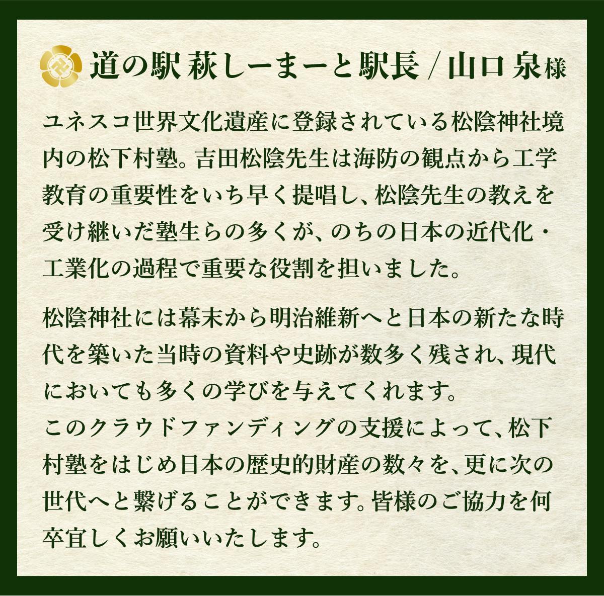 吉田松陰先生をはじめ、松下村塾の塾生の面々が歩んだ旧松本村の道が、現在では松門神社参道として、また「学びの道」としてご参詣の方々に親しまれている事をこの上なく喜ばしく感じておりますとともに、松陰先生のお言葉が全国の皆様の心へ届き、本企画を通してご賛同の輪が広がっていくことを願ってやみません。