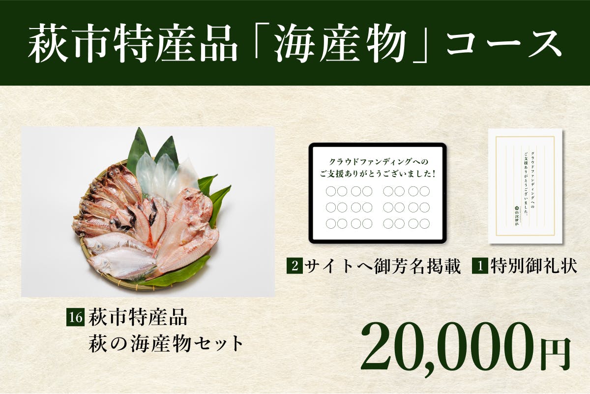 山口県萩市の特産品をお届けします。地元で採れた海産物や江戸時代から続く伝統工芸など、萩市の魅力を堪能しながらプロジェクトを応援いただけるコースです。