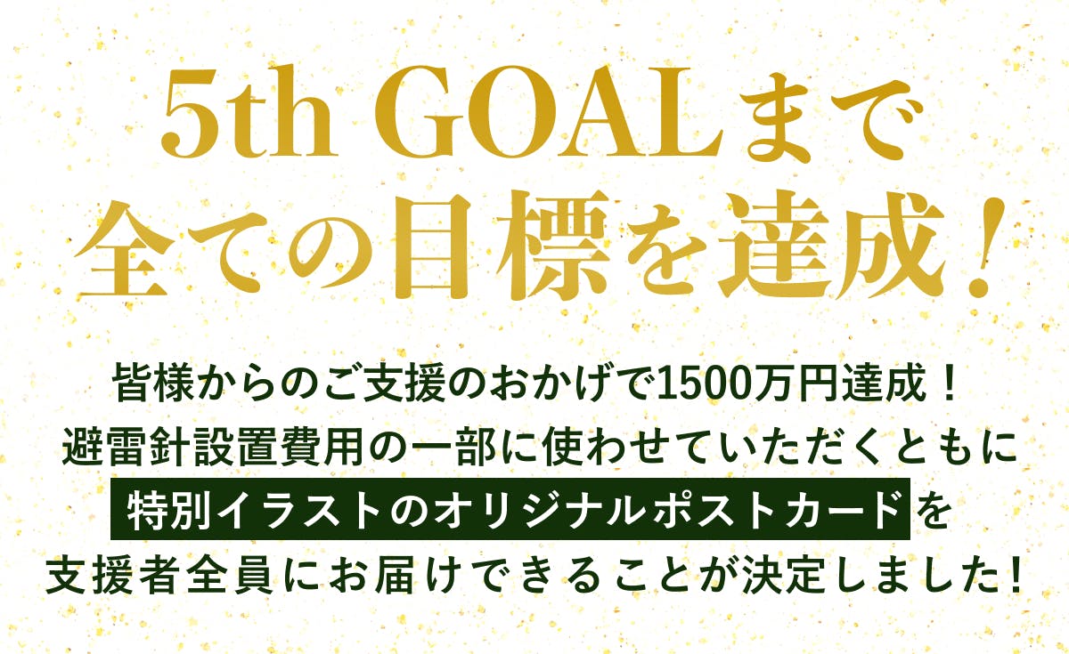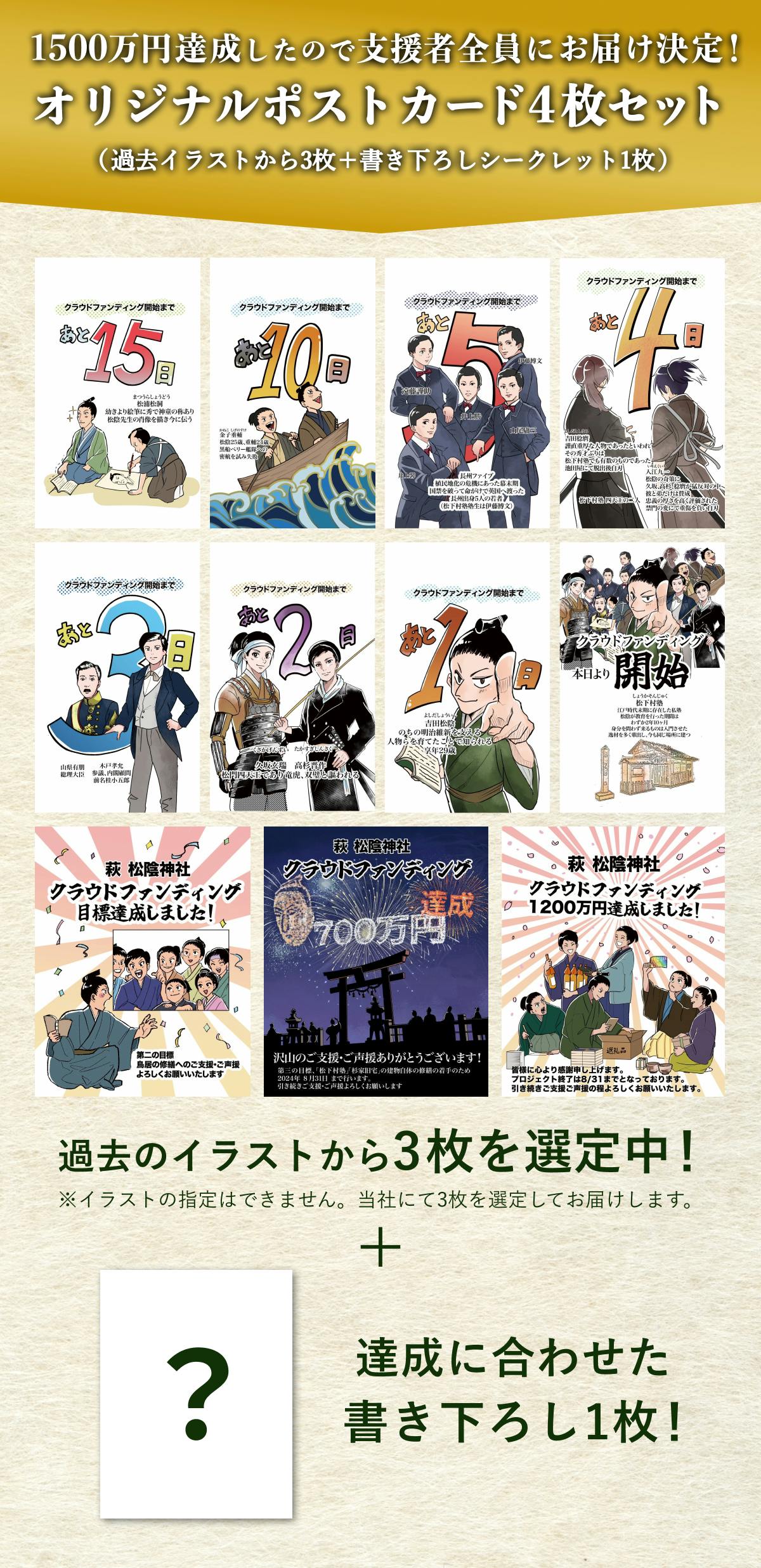 また、1500万円達成により、支援者様全員へのオリジナルポストカードのお届けが決定しました!これまで当社の巫女が描いてくれていたオリジナルイラストをSNSで投稿してきました。このイラストへの好評の声を受けて、1500万円達成を条件にリターンに追加しようと考えていましたが、残り期間も少なく、皆様に届けられるかハラハラもしておりました。無事1500万円を達成しポストカードをお届けできることを大変嬉しく思います!