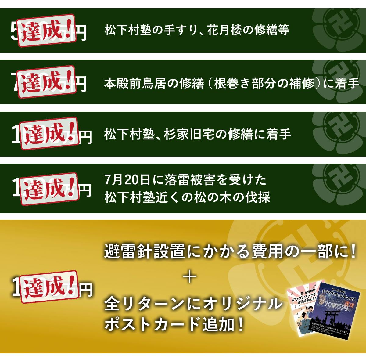 6月14日のプロジェクト公開から2週間たらずで目標金額の500万円を突破。さらに、ネクストゴールの700万円、1000万円、1200万円、と順調に突破し、ついには最後のゴールであった1500万円を突破することができました。本殿前鳥居の修繕着手に加え、松下村塾・杉家旧宅の修繕、そして落雷被害を受けて倒木の恐れがあった松の木の伐採にも着手することができます。また、皆様のおかげで、なかなか実現できずにいた避雷針の設置にも手が届きそうです。境内の史跡がこれ以上落雷の脅威に晒されないよう、皆様から預かった大切な支援金額を、避雷針設置費用の一部に充てたいと考えております。