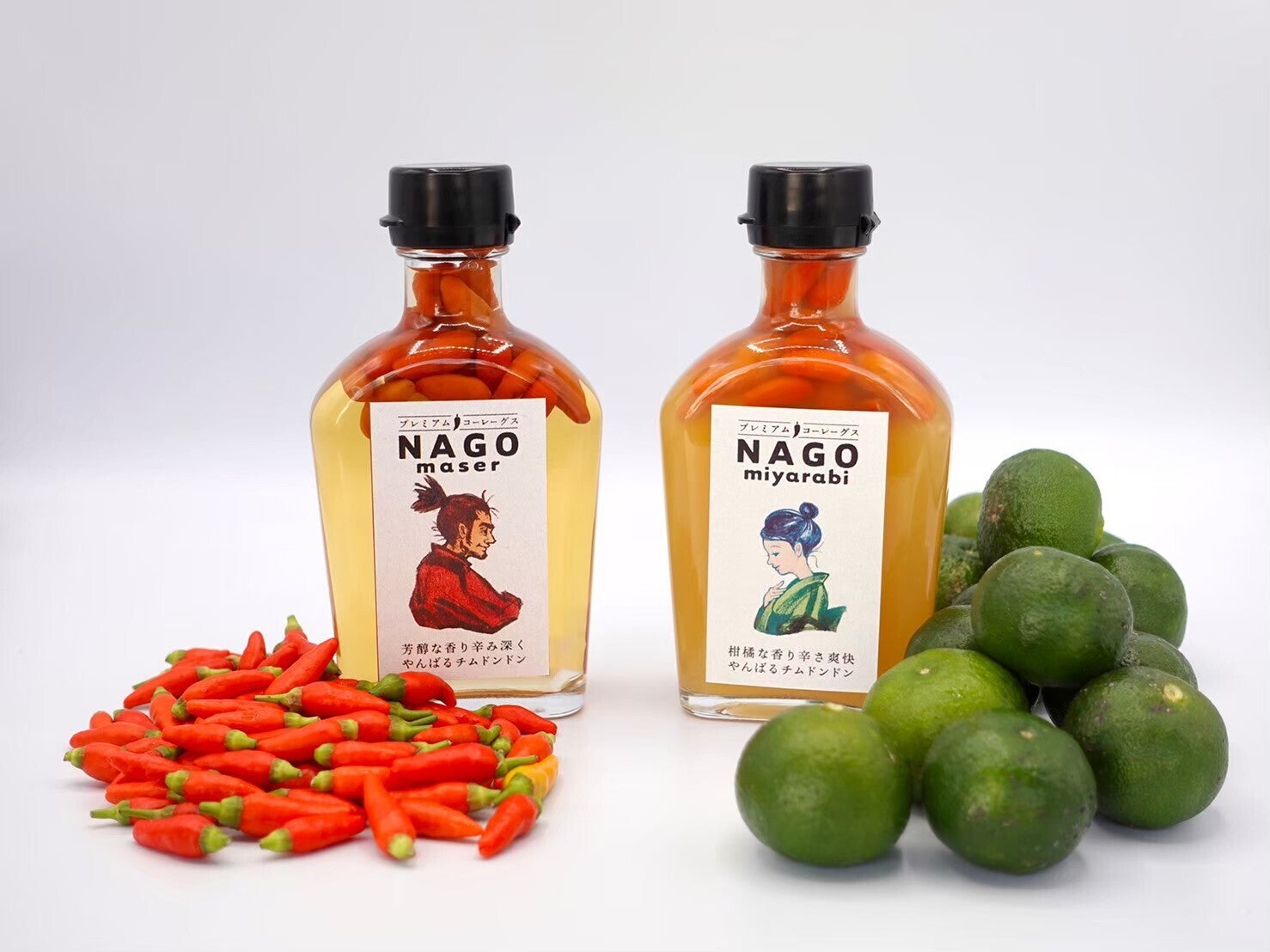 シークヮーサー果汁とカーブチー果汁をブレンドし爽やかな辛さに仕上げた「ナゴミヤラビ」の2種セット。