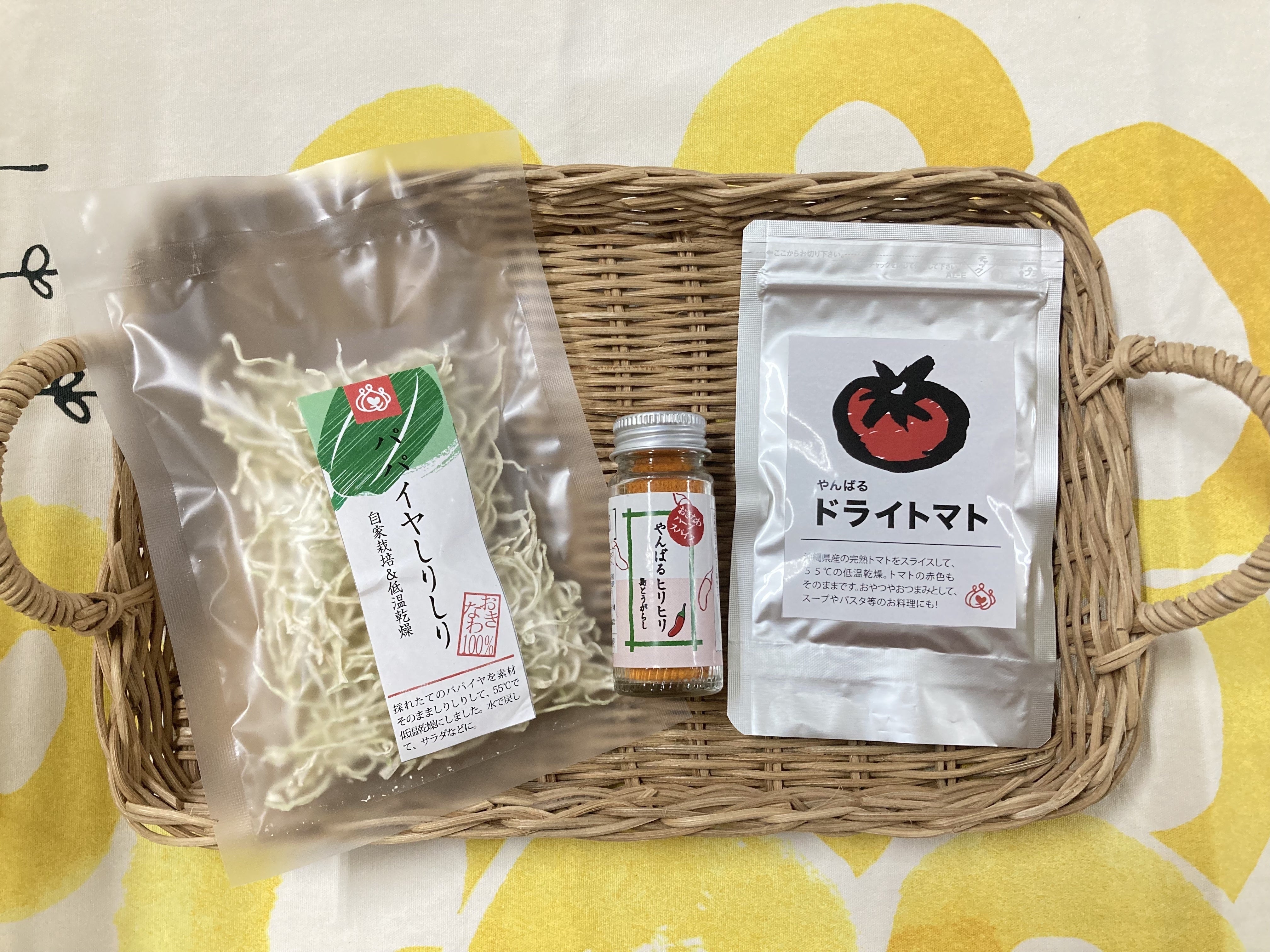 その中で今回は、人気の「パパイヤしりしり」「やんばるヒリヒリ」「ドライトマト」をセットにしました!