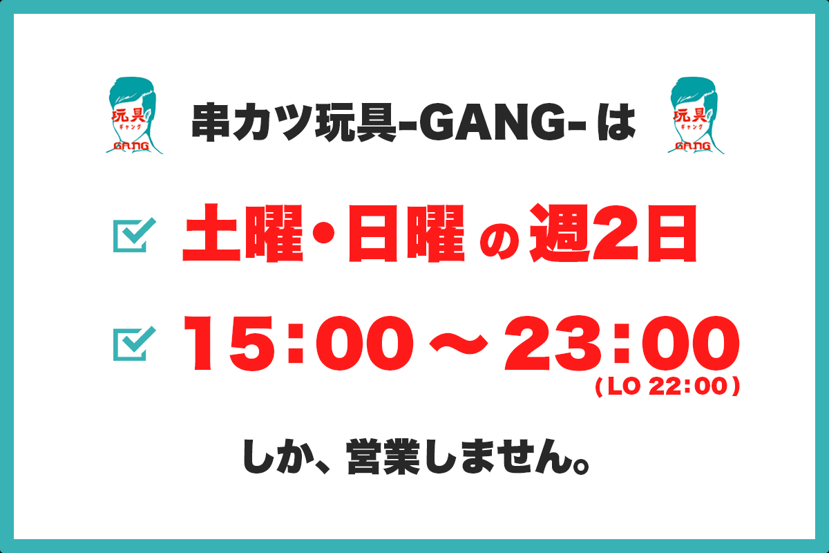 続きまして営業時間についてなのですが、「串カツ玩具-GANG-」は通常の飲食店のような毎日営業や、深夜までの営業を行いません。