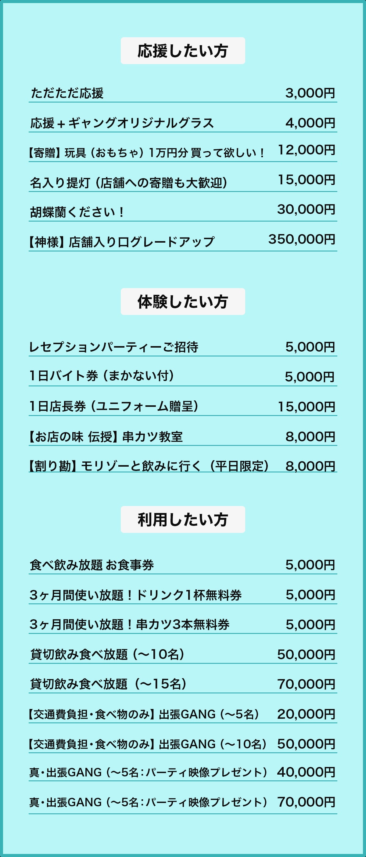 *支援頂いた資金は全て営業に充てさせて頂き、リターンはOPEN日である4月29日以降から利用可能