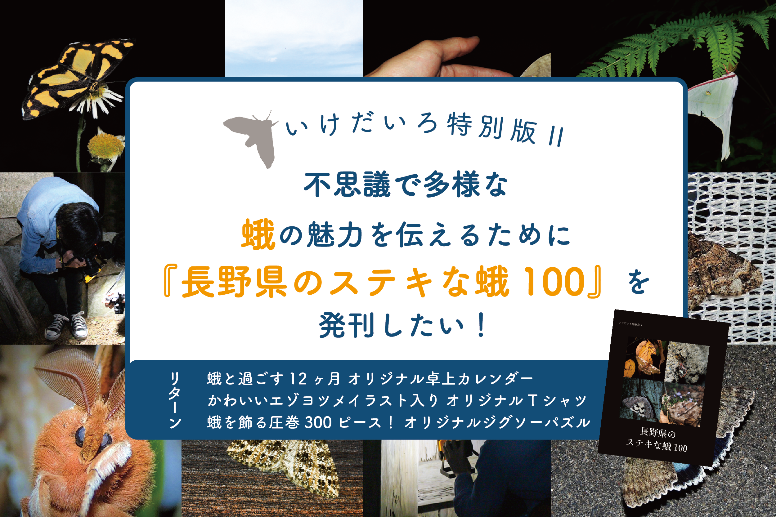 こうした背景から、このたび私たちはクラウドファンディングに挑戦し『長野県のステキな蛾100』を発刊することにしました。今回あえて池田町ではなく長野県とした理由は、ある特定の地域に閉じること無くできる限り多くの人に、蛾の魅力を知っていただき楽しんでもらいたいと考えたためです。