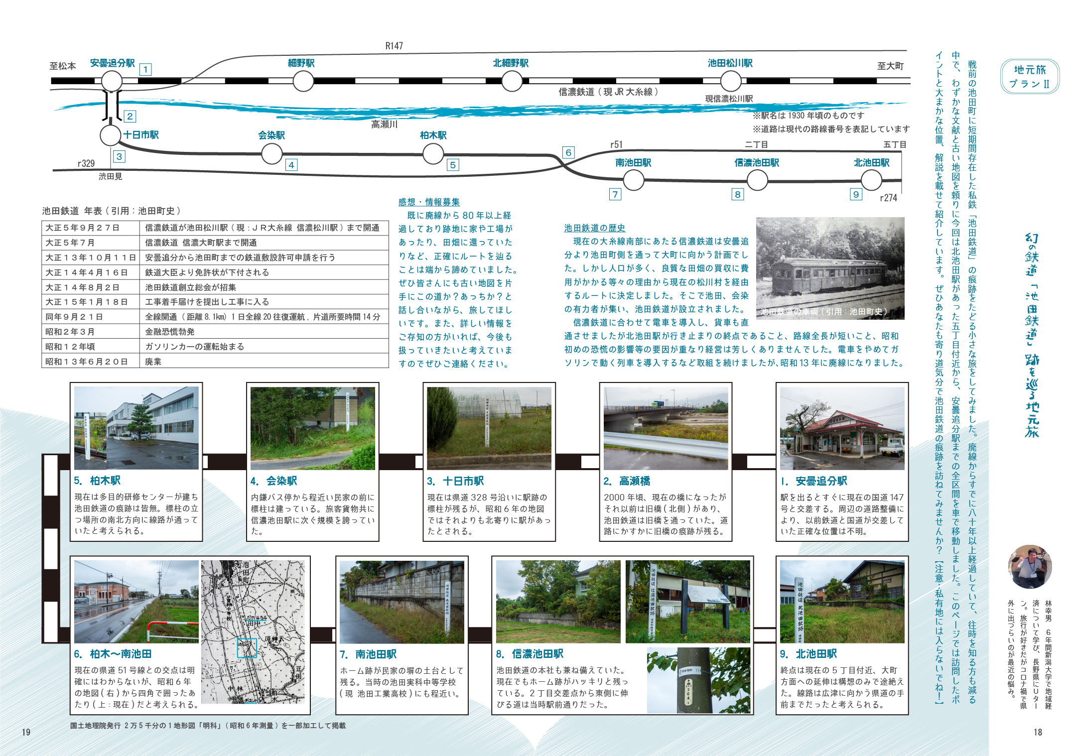 毎号、特集を組んで楽しみながら地域について学べる記事も掲載しています。この記事は、池田町に昔あった鉄道路線「池田鉄道」の名残を探す地元旅の紹介記事。新型コロナウイルスの流行で遠方に出られなくても、地域をまなざす角度を変えることで発見や驚きがあることを発信しました。