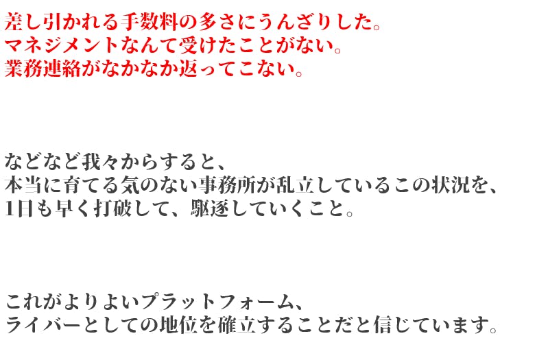 2023/04/26 22:33みなさまこんにちは!代表の西村です!4月25日0:00~クラウドファンディングがスタート致しました!ライバーって何だろう?興味はあるけど・・・自分も表現者として配信してみたいけど・・・副業としてやってみたいけど・・・いろんな思いがそれぞれおありだと思います。ただ、今のライブ配信者を取り巻く環境は決して恵まれているとは言い難いのが現状です。もちろん、真っ当に事務所として営業されているところも一部ではありますが、あります。我々が目指しているのは、happy LaPisという名前に託したように、原石を煌めかせることができる事に喜びを見いだせる集団でありたいという事です。ここで少しhappy LaPisについて解説していきましょう!私たちだけが成功すればそれでよいということではありません。クラウドファンディングで関わってくださった皆様、そして、これから集うライバー様、それを視聴してくださるリスナー様、オーディエンスの皆様すべてに愛情をもって接することで、Win-Win-Winな関係性を構築できると信じています。これだけ書くと綺麗ごとのように見えるかもしれませんが、我々は泥臭くてもいい、真剣にこの”愛と平和”をこのhappy LaPisから作り上げたいと思っています。ライバーを応援したい方、そして、これからライバーとして活動したい方、そして純粋に我々と愛と平和を追い求めたいという純粋な気持ちをもっていらっしゃる画面の前の”あなたと”是非私たちと一緒に始めませんか?happy LaPis もっと見る