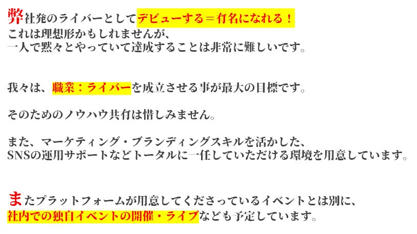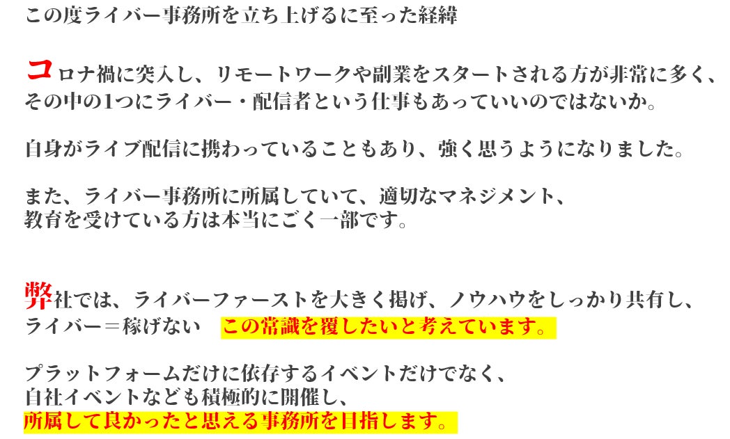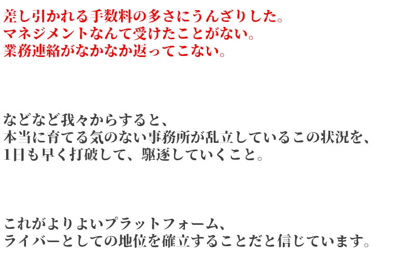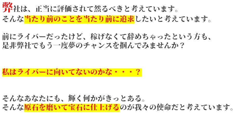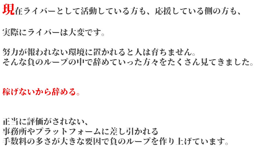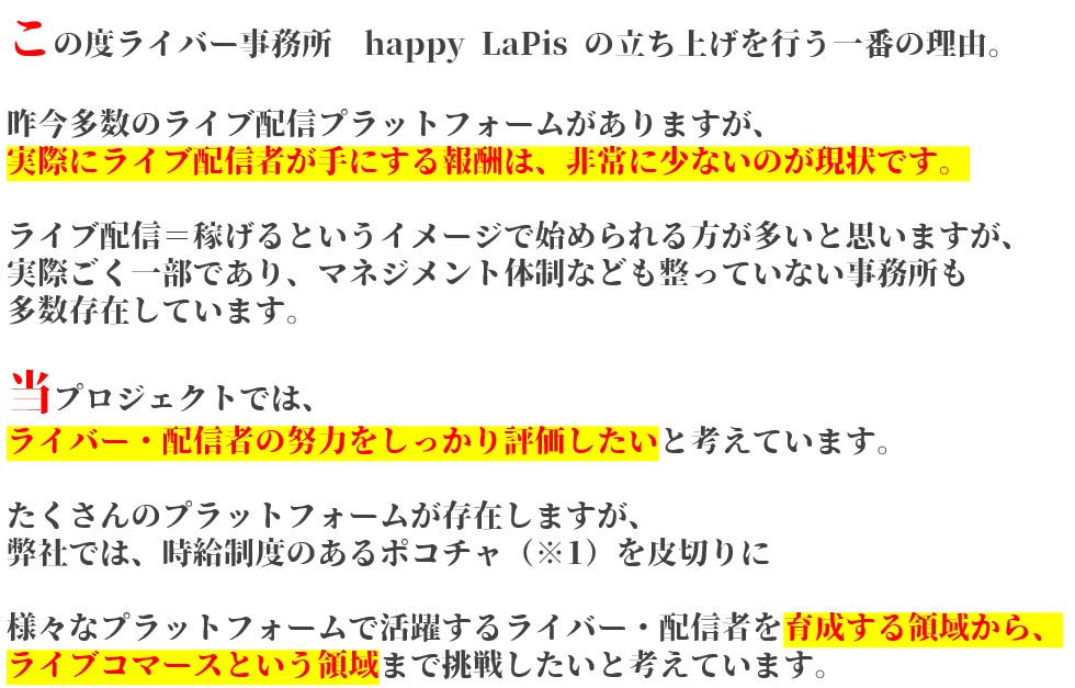 2023/04/26 22:33みなさまこんにちは!代表の西村です!4月25日0:00~クラウドファンディングがスタート致しました!ライバーって何だろう?興味はあるけど・・・自分も表現者として配信してみたいけど・・・副業としてやってみたいけど・・・いろんな思いがそれぞれおありだと思います。ただ、今のライブ配信者を取り巻く環境は決して恵まれているとは言い難いのが現状です。もちろん、真っ当に事務所として営業されているところも一部ではありますが、あります。我々が目指しているのは、happy LaPisという名前に託したように、原石を煌めかせることができる事に喜びを見いだせる集団でありたいという事です。ここで少しhappy LaPisについて解説していきましょう!私たちだけが成功すればそれでよいということではありません。クラウドファンディングで関わってくださった皆様、そして、これから集うライバー様、それを視聴してくださるリスナー様、オーディエンスの皆様すべてに愛情をもって接することで、Win-Win-Winな関係性を構築できると信じています。これだけ書くと綺麗ごとのように見えるかもしれませんが、我々は泥臭くてもいい、真剣にこの”愛と平和”をこのhappy LaPisから作り上げたいと思っています。ライバーを応援したい方、そして、これからライバーとして活動したい方、そして純粋に我々と愛と平和を追い求めたいという純粋な気持ちをもっていらっしゃる画面の前の”あなたと”是非私たちと一緒に始めませんか?happy LaPis もっと見る