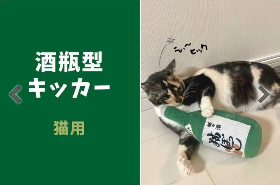 そして、プロジェクトのリターン品にラインナップしている猫用のけりぐるみ「酒瓶キッカー」の姿が!日本酒の瓶のようなこのおもちゃは、猫ちゃんたちに大人気。そしてなんと言っても、愛猫が大酒飲みになったかのような姿に飼い主がメロメロに酔わされます。(笑)