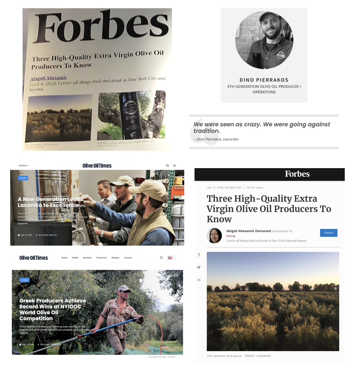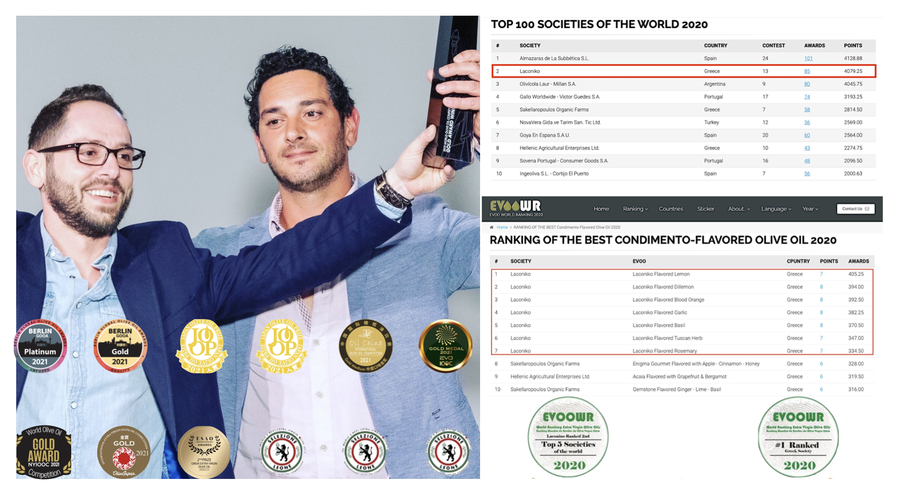 LACONIKOは世界的経済誌『Forbes』や『Olive Oil Times』にも掲載され、数々の賞を受賞しています。米国やギリシャのみならず、世界の国々にLACONIKOファンを獲得し、2020年にはエキストラバージンオリーブオイル部門で世界ランキング2位、フレーバーオイルは世界ランキング1位まで上りつめ、毎年数多くの賞を受賞しています。フレーバーオイル部門では、ブラッドオレンジオリーブオイルやバジルオリーブオイルなど世界ランキング1位から7位までを総なめにしLACONIKOを多くの方に知っていただくきっかけとなりました。