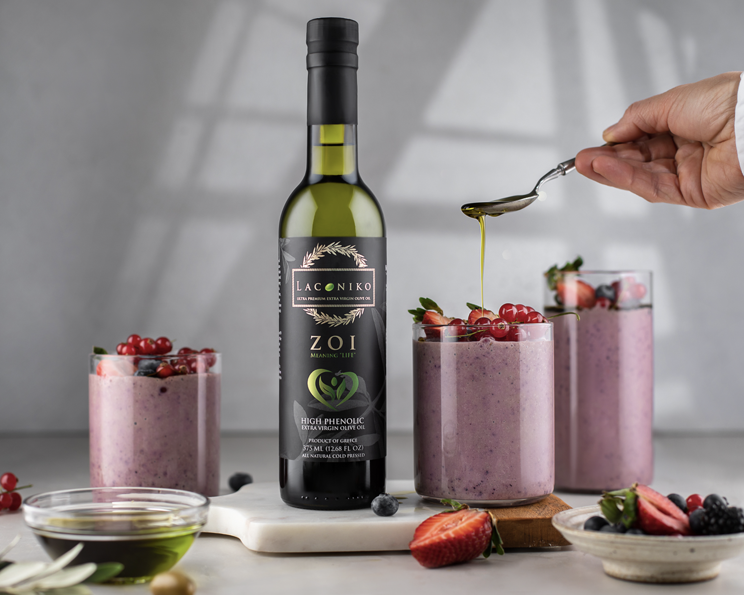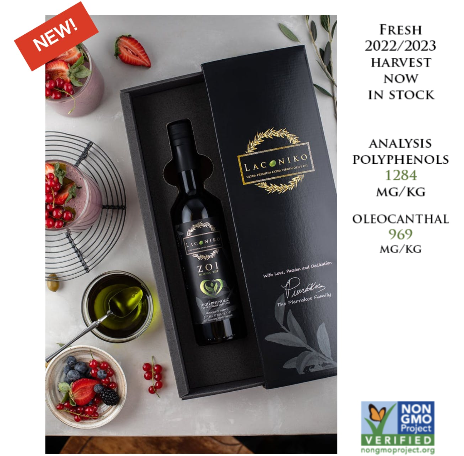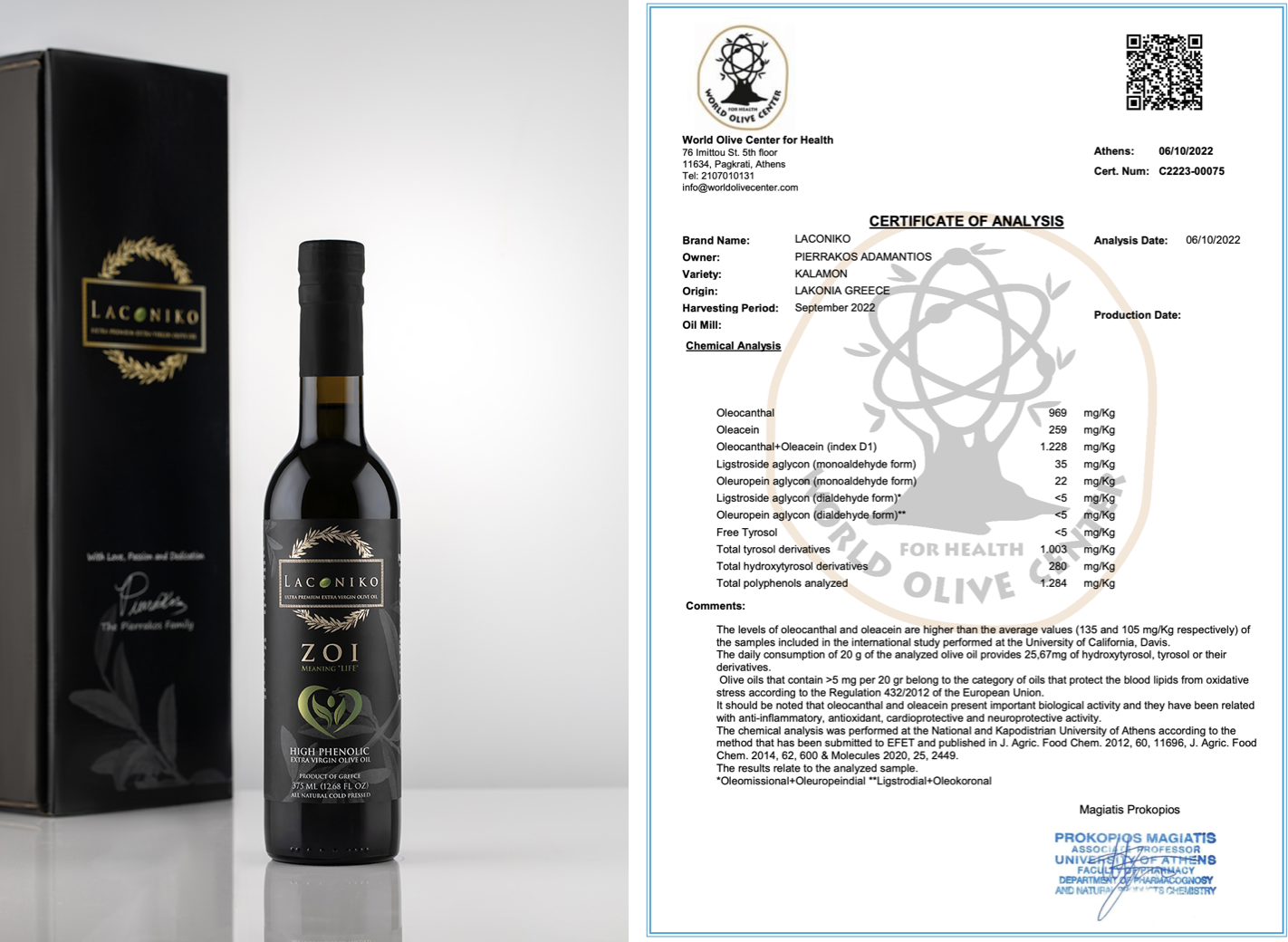 今年2023年、LACONIKOはカラモン種から搾った新商品ZOIをプロデュースしました。『ZOI』はギリシャ語で「生命」を意味します。カラモン種という品種の特徴を最大限に活かしつつ収穫時期も10月上旬と早い時期に行い1本1本丁寧にボトリングしたZOI 。「超高ポリフェノール/オレオカンタールオイル」です!