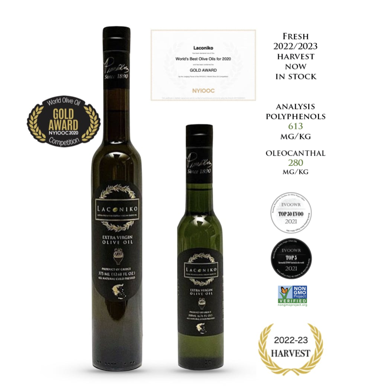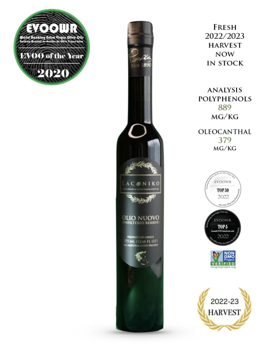 2022年に高フェノールオリーブオイルとして認定されたLACONIKOオリオ・ヌオーヴォは2022年より2年連続でNYIOOC(ニューヨーク国際オリーブオイル大会)で金賞を受賞、その他にも数多くの国際オリーブオイル大会で複数の金賞を受賞しています。収穫を開始してから2週間以内にボトリングまでを行った⻘々しいフレッシュな⾵味が際⽴つ旬な美味しさをお楽しみください。2023年の化学分析結果でもポリフェノール値889mg/kgと⾮常に⾼い数値を記録しています。毎年入荷とともにすぐに売り切れとしまう大人気オイルです!