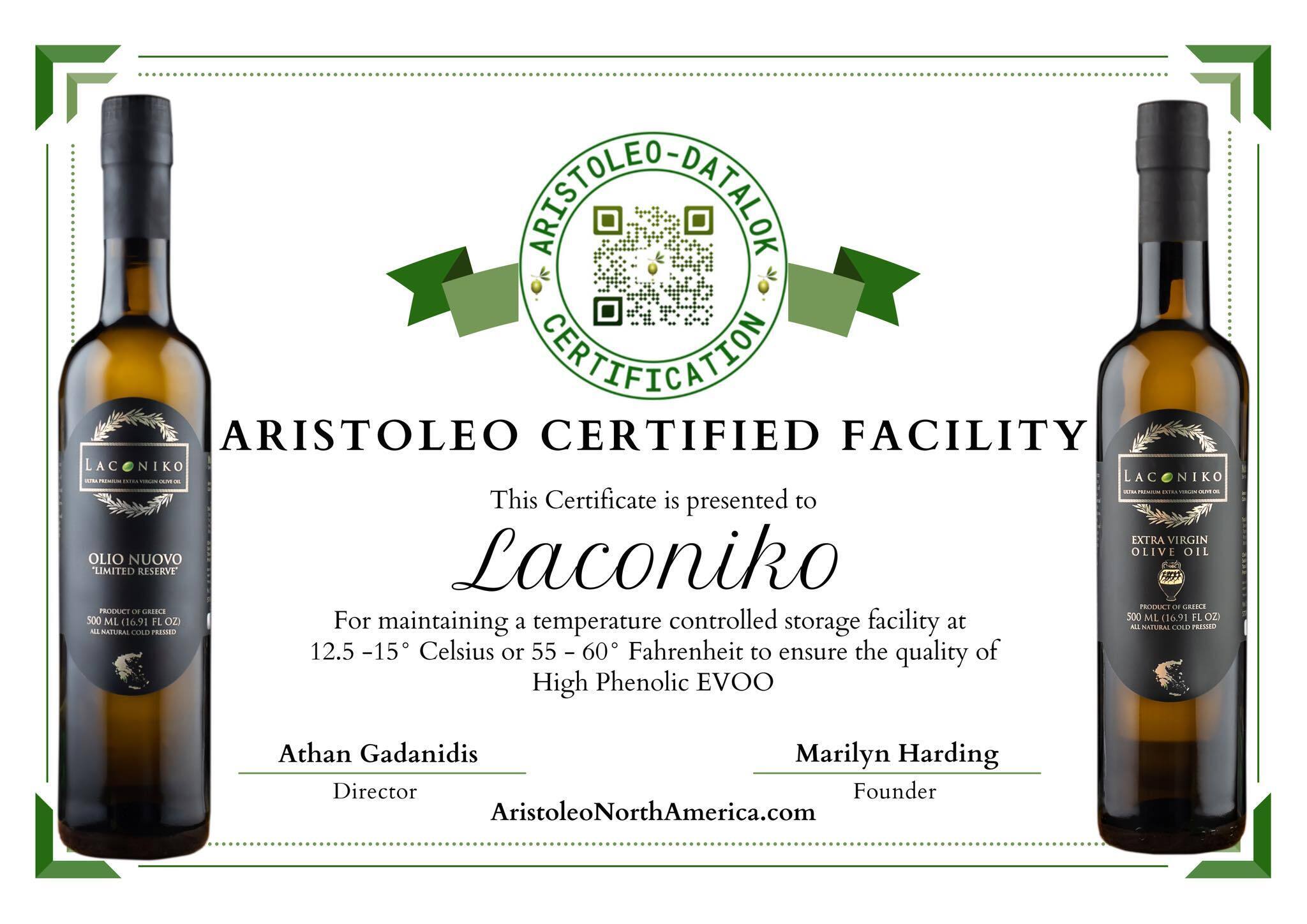 LACONIKOオリオ・ヌオーヴォは2021年、その品質の高さが認められ『高フェノールエキストラバージンオリーブオイル』としてARISTOLEO CERTIFIED FACILITYより認定、その翌年のオリオ・ヌオーヴォ(2022年のポリフェノール値は1070mg/kg)も⾮常に⾼い数値を記録し、ARISTOLEO High Phenolic Olive Oil Awards Best OliveOilより “Best Olive Oilブランド”として金賞をいただきました。この賞は、高ポリフェノール濃度800〜1199mg/kgを含む質の良いオリーブオイルを生産したオリーブオイルブランドに贈られるものです。