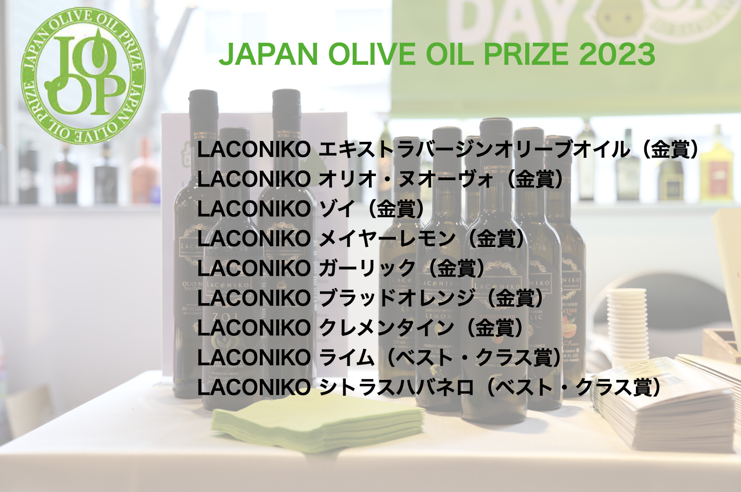 日本で最も権威のある国際オリーブオイル大会の1つ、『JOOP2023年度ジャパンオリーブオイルプライズ』にて、9つの賞を受賞いたしました。