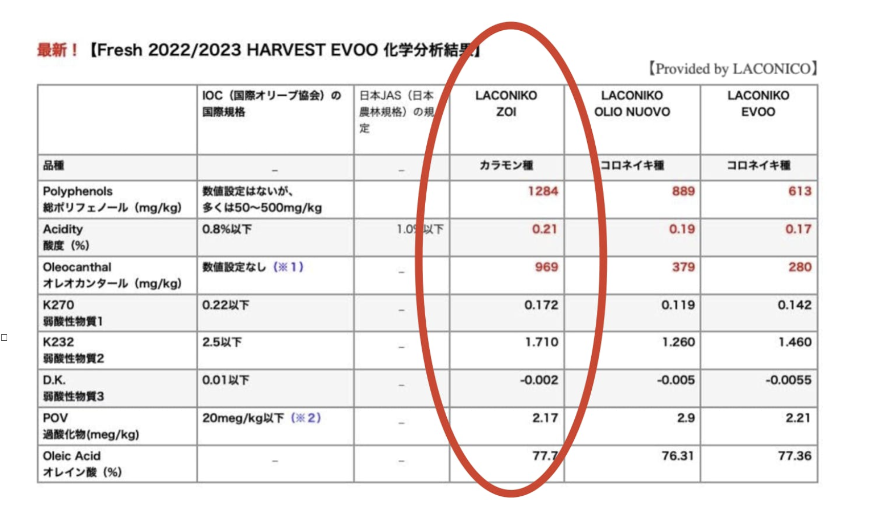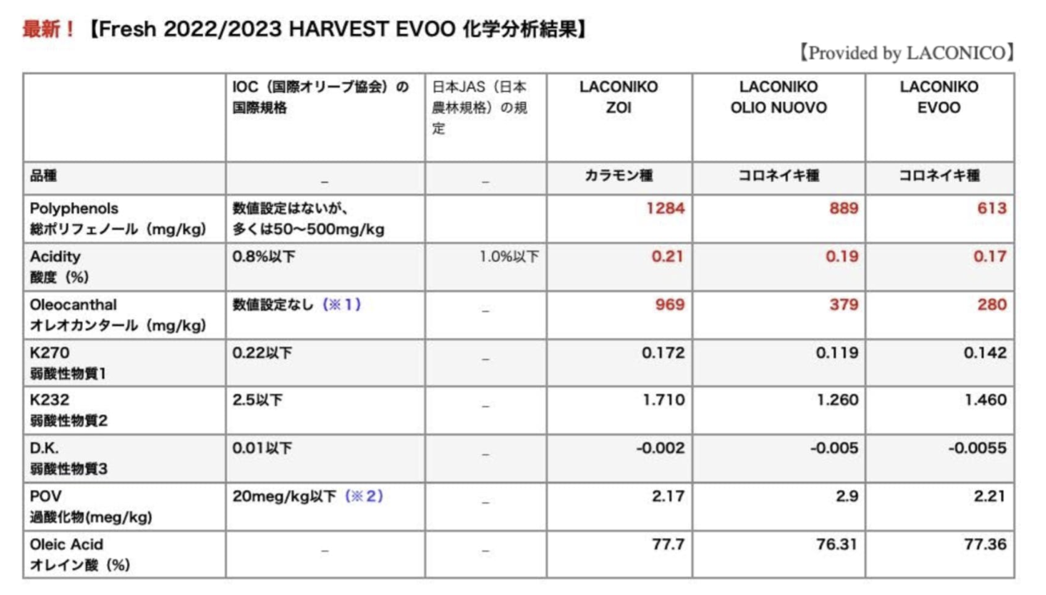 下記の表は IOC(国際オリーブオイル協会)と日本JAS(日本農林規格)がエキストラバージンオリーブオイルと定義するオイル基準値とLAOCONIKOの各オイルの最新科学分析結果を比較しまとめたものです。