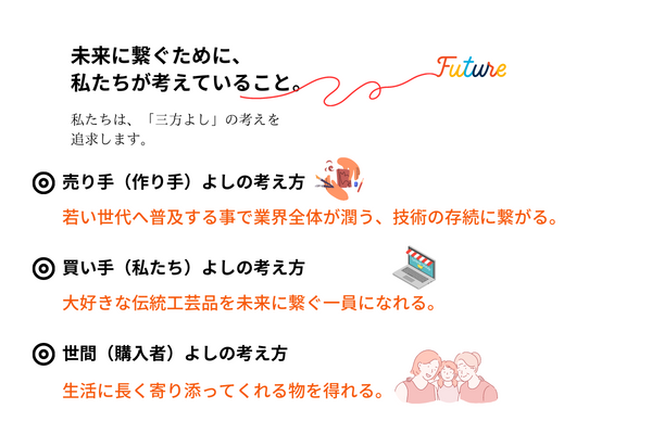 この事業を通して伝統工芸品を広め、存続させ、技術者の育成支援をし、100年先も伝統工芸品を残し続ける環境を整えたいと思っています。