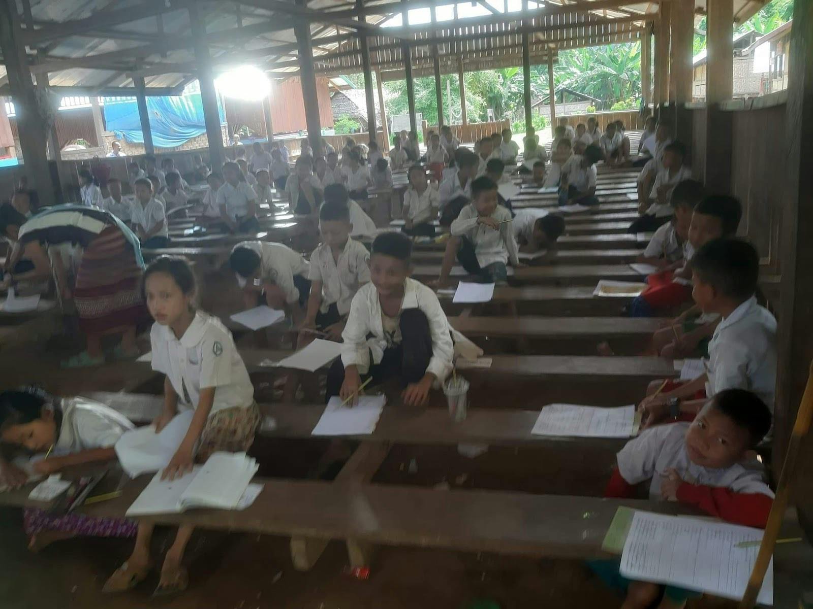 現地からの情報によると、このキャンプ内の学校に通う子供たちは、カレン州にある村の出身で、クーデター後はキャンプで避難生活を送りながら学校で勉強を続けています。キャンプはすでに多くの避難民が住んでいて、一緒に避難することのできなかった彼らの両親は日中は村で過ごし、夜は空爆から身を守るため森に隠れているそうです。子供たちは、空爆を受ける可能性が低い日中に家族の無事を確かめるため、村を定期的に訪れています。