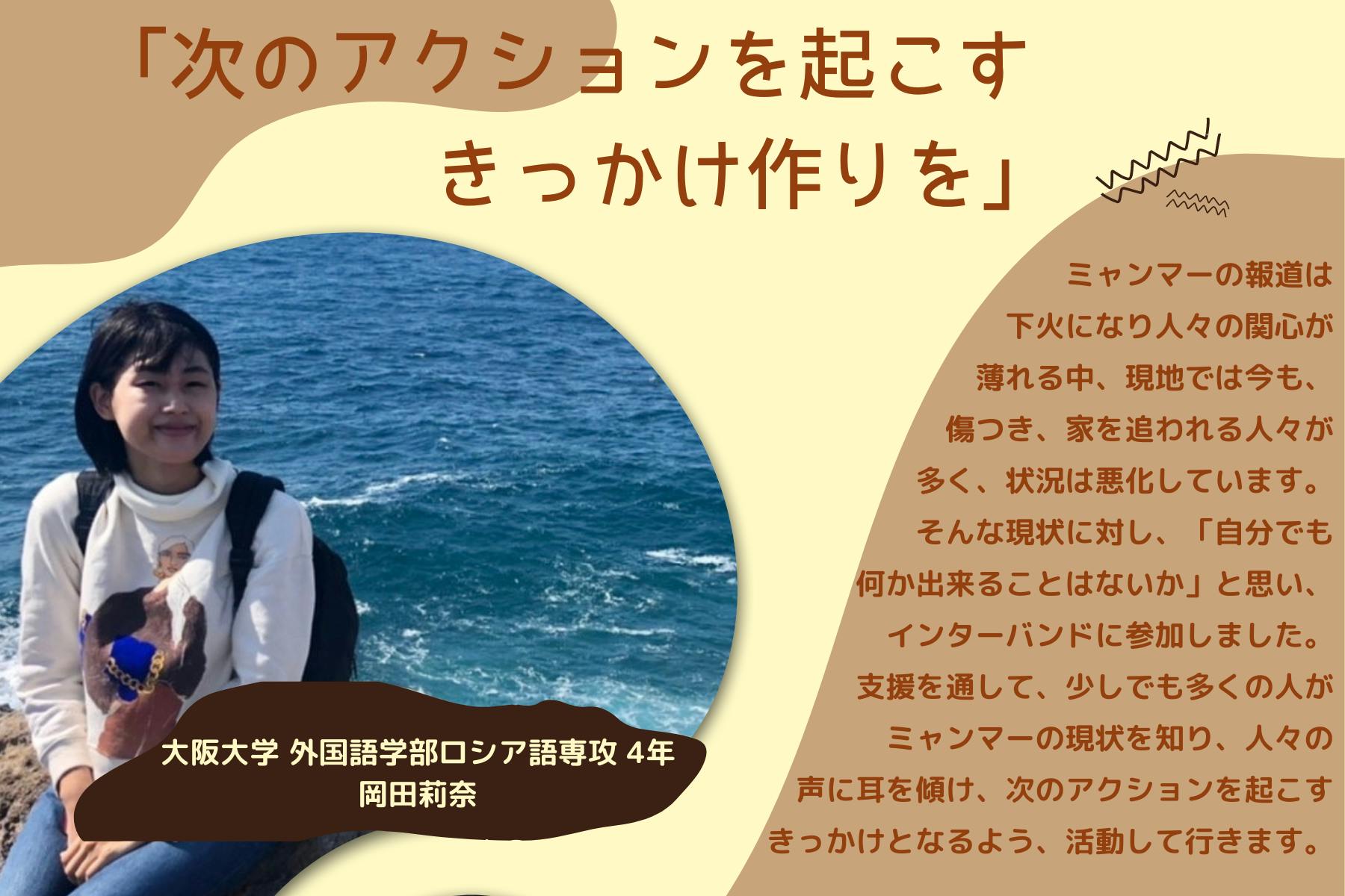 2023/03/30 14:31こんにちは。インターンの野地です。3月3日より約1ヶ月間にわたって開催してきかクラウドファンディングキャンペーン「空爆が続くミャンマーへ。教育支援で子どもたちに明るい未来を。」いよいよ残り2日となりました!ここまで、一緒に頑張ってきたメンバー、そしてご支援・ご協力をいただいた全ての皆様に、感謝いたします。残り二日ですが、最後まで皆様とともに、思いを繋ぐため活動に邁進して参りますので、どうぞよろしくお願いいたします。さて、本日の学生メンバーインタビューは大黒怜さんです。今回のキャンペーンでは板倉くんと共にイベントの企画・運営を主に担当していただきましたが、最近のインターバンドでの活動では、「グローバル政策提言バンド」を主に引っ張っていってくれているのが大黒さんです。私も先日実際にお会いしましたが、どんなことにも物怖じせず、積極的に発言したり活動に参加したりと、さまざまな役割を担う大黒さんは、とても頼れる存在です。------------------------------------------------------------------------------------------------------------------------Q. まずは簡単に自己紹介をお願いします!どうも、はじめまして。学生インターンの大黒怜(ダイコク レイ)です。 関西学院大学院総合政策研究科に所属しています。大学院では、SDGsや国際協力、開発等について学んでいます。インターバンド でインターンをしようと思った理由は、大学院の授業で平和構築について学び活動内容に興味があったこと、また現場に近い存在として学生主体で活動できることが魅力的だったためです。Q.大黒さんは、クラウドファンディングキャンペーン準備期間から、タイのパートナー団体Emergency Relief Teamと綿密に連絡をとっていただいたと思います。連絡をとる上で難しいと感じたことはありますか?やはりコミュニケーションの取り方が難しいと思いました。その理由は主に二つあって、一つがオンラインテキストを通してのやり取りであること、もう一つが言語の壁があることでした。 本来であれば、私たちが現地に行ってインタビューをすることがベストですが、現状ではそれができないので、現地とのやりとりは全てSNSのテキストメッセージで行っています。そのため、私の思いや聞きたいことが上手く伝わらなかったりすることがあったり、英語が通じなかったりと、意思の疎通がとれず悩むこともありました。ですが、そもそも彼らは現場の支援活動で忙しいですし、団体と私の信頼関係が築けていないことも原因なのではないかと思っていました。 そこで、「今自分たちはこういう活動をしているから、この情報が今すぐ欲しい」と丁寧に説明してお願いしてみたり、英語が難しければGoogle翻訳でタイ語に翻訳してみたりと色々工夫してコミュニケーションを取るように心がけたところ、よりスムーズにやり取りができるようになったと感じています。Q.現地との連絡をとる中で印象に残ったことはありますか?一度、団体にお願いして現地の状況を知るためにインタビューをしたことがあったのですが、用意した質問に一つずつ丁寧に答えてもらい、ほんと皆さん温かくて優しい人たちだなと思いました。 Emergency Relief Teamはタイ側のカレン族の人たちの団体ですが、インタビューにはミャンマーカレン族でカレン州の村から避難してきた人ともお話しすることができ、有益な情報を得ることができました。Q.大黒さんは、イベントではディスカッションでファシリテーターを勤めていただきましたが、印象に残ったことはありましたか?私自身、今まで社会人の方々がいる場所でファシリテーターを務めたことがなかったため最初は不安でしたが、毎回参加者の方々の鋭い問題意識や斬新な意見に助けられ、司会進行しやすかったです。私も素人なので、参加者の方々から学ぶことも多かったので、今後もっと定期的にそうした場を設けたいと思っています。Q.最後に、皆様にメッセージをお願いします!!今月の上旬から始まった私たちのプロジェクトですが、終了まで残りわずかとなりました。すでにご協力いただきました皆様に心から厚く御礼申し上げます。 知識も経験もない私たちですが、少しでも現地への支援につながるよう尽力して参りました。正直なところ、当初の目標を達成するのは難しいですが、出来るだけ多くの支援物資を困っているカレン族の人たちに届けたいと思っています。 森の中で空爆に怯えながらもたくましく生きるカレン族の人たちのために、どうかお力を貸してください。------------------------------------------------------------------------------------------------------------------------直接現地と連絡を取る中で、大黒さんが現地からさまざまな情報を引き出してくれること、彼らに、考えて、工夫して、理解し、寄り添うことで信頼を得ることが私たちの現地の声に沿った支援を行う上ではとても大切です。インターバンドとパートナー団体とのつながりを長く太く繋ぐために