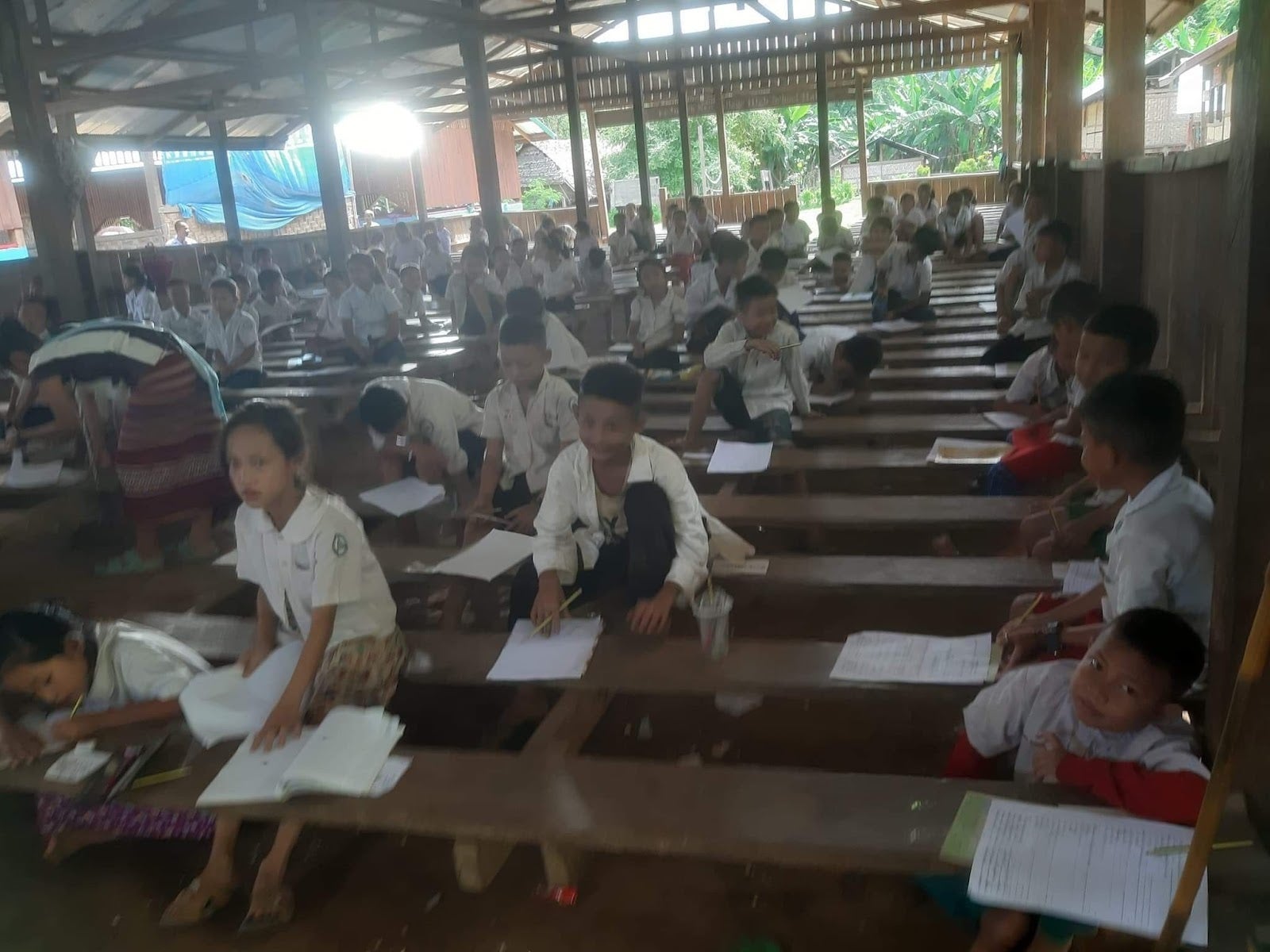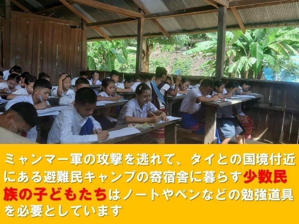 現地からの情報によると、このキャンプ内の学校に通う子供たちは、カレン州にある村の出身で、クーデター後はキャンプで避難生活を送りながら学校で勉強を続けています。キャンプはすでに多くの避難民が住んでいて、一緒に避難することのできなかった彼らの両親は日中は村で過ごし、夜は空爆から身を守るため森に隠れているそうです。子供たちは、空爆を受ける可能性が低い日中に家族の無事を確かめるため、村を定期的に訪れています。