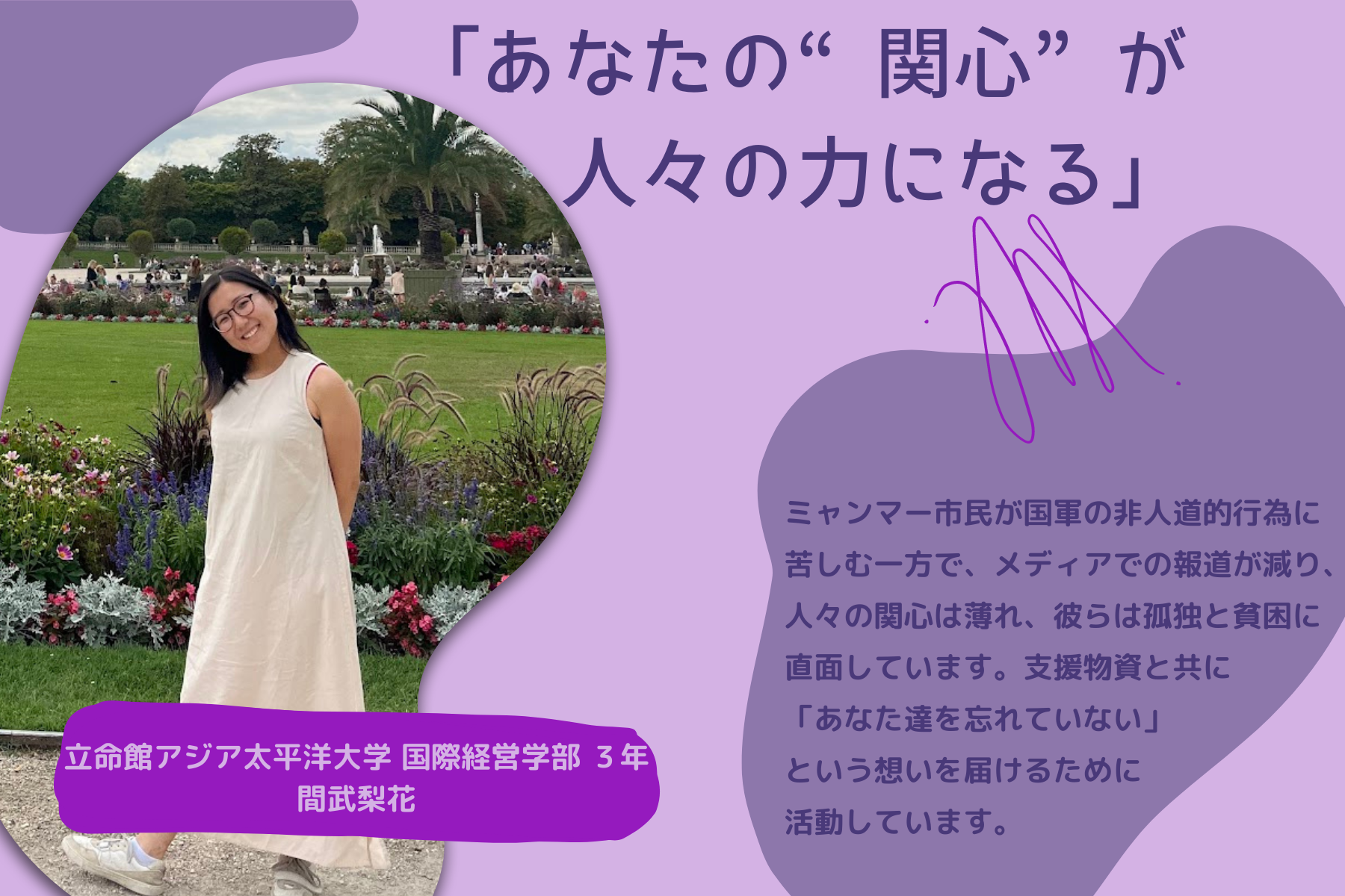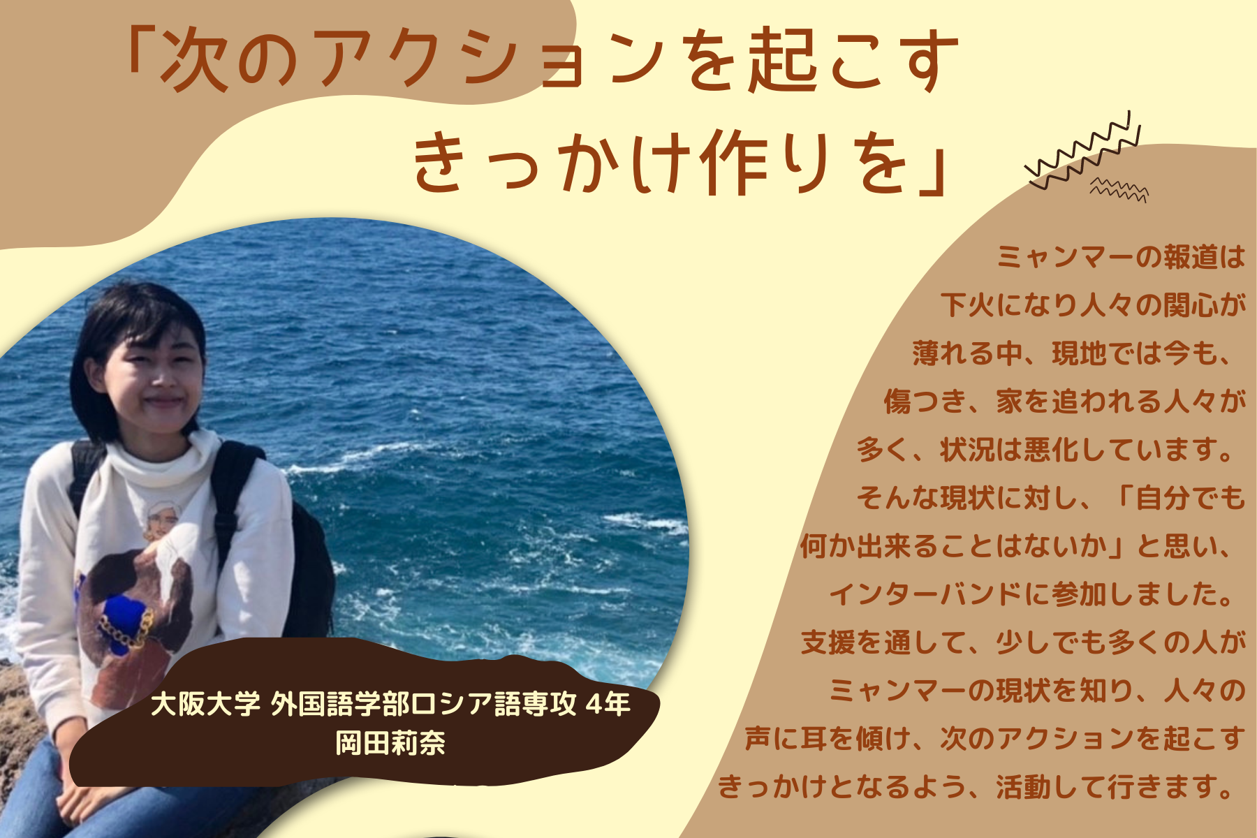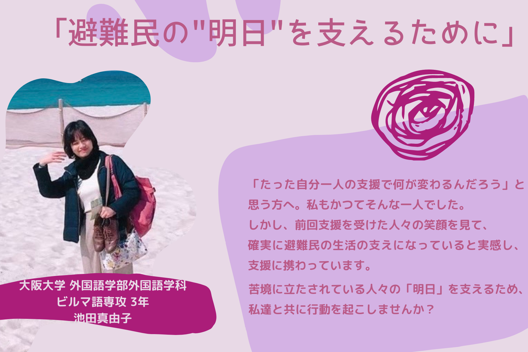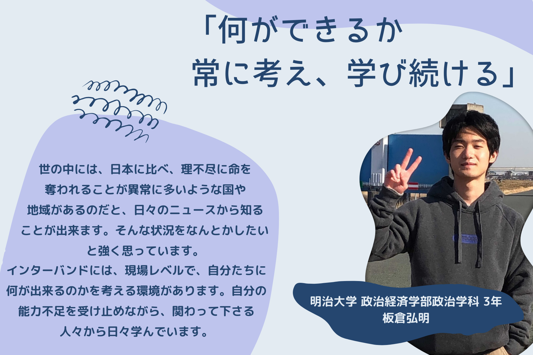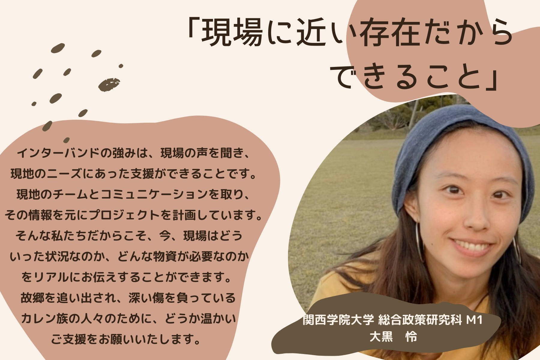 2023/03/30 14:31こんにちは。インターンの野地です。3月3日より約1ヶ月間にわたって開催してきかクラウドファンディングキャンペーン「空爆が続くミャンマーへ。教育支援で子どもたちに明るい未来を。」いよいよ残り2日となりました!ここまで、一緒に頑張ってきたメンバー、そしてご支援・ご協力をいただいた全ての皆様に、感謝いたします。残り二日ですが、最後まで皆様とともに、思いを繋ぐため活動に邁進して参りますので、どうぞよろしくお願いいたします。さて、本日の学生メンバーインタビューは大黒怜さんです。今回のキャンペーンでは板倉くんと共にイベントの企画・運営を主に担当していただきましたが、最近のインターバンドでの活動では、「グローバル政策提言バンド」を主に引っ張っていってくれているのが大黒さんです。私も先日実際にお会いしましたが、どんなことにも物怖じせず、積極的に発言したり活動に参加したりと、さまざまな役割を担う大黒さんは、とても頼れる存在です。------------------------------------------------------------------------------------------------------------------------Q. まずは簡単に自己紹介をお願いします!どうも、はじめまして。学生インターンの大黒怜(ダイコク レイ)です。 関西学院大学院総合政策研究科に所属しています。大学院では、SDGsや国際協力、開発等について学んでいます。インターバンド でインターンをしようと思った理由は、大学院の授業で平和構築について学び活動内容に興味があったこと、また現場に近い存在として学生主体で活動できることが魅力的だったためです。Q.大黒さんは、クラウドファンディングキャンペーン準備期間から、タイのパートナー団体Emergency Relief Teamと綿密に連絡をとっていただいたと思います。連絡をとる上で難しいと感じたことはありますか?やはりコミュニケーションの取り方が難しいと思いました。その理由は主に二つあって、一つがオンラインテキストを通してのやり取りであること、もう一つが言語の壁があることでした。 本来であれば、私たちが現地に行ってインタビューをすることがベストですが、現状ではそれができないので、現地とのやりとりは全てSNSのテキストメッセージで行っています。そのため、私の思いや聞きたいことが上手く伝わらなかったりすることがあったり、英語が通じなかったりと、意思の疎通がとれず悩むこともありました。ですが、そもそも彼らは現場の支援活動で忙しいですし、団体と私の信頼関係が築けていないことも原因なのではないかと思っていました。 そこで、「今自分たちはこういう活動をしているから、この情報が今すぐ欲しい」と丁寧に説明してお願いしてみたり、英語が難しければGoogle翻訳でタイ語に翻訳してみたりと色々工夫してコミュニケーションを取るように心がけたところ、よりスムーズにやり取りができるようになったと感じています。Q.現地との連絡をとる中で印象に残ったことはありますか?一度、団体にお願いして現地の状況を知るためにインタビューをしたことがあったのですが、用意した質問に一つずつ丁寧に答えてもらい、ほんと皆さん温かくて優しい人たちだなと思いました。 Emergency Relief Teamはタイ側のカレン族の人たちの団体ですが、インタビューにはミャンマーカレン族でカレン州の村から避難してきた人ともお話しすることができ、有益な情報を得ることができました。Q.大黒さんは、イベントではディスカッションでファシリテーターを勤めていただきましたが、印象に残ったことはありましたか?私自身、今まで社会人の方々がいる場所でファシリテーターを務めたことがなかったため最初は不安でしたが、毎回参加者の方々の鋭い問題意識や斬新な意見に助けられ、司会進行しやすかったです。私も素人なので、参加者の方々から学ぶことも多かったので、今後もっと定期的にそうした場を設けたいと思っています。Q.最後に、皆様にメッセージをお願いします!!今月の上旬から始まった私たちのプロジェクトですが、終了まで残りわずかとなりました。すでにご協力いただきました皆様に心から厚く御礼申し上げます。 知識も経験もない私たちですが、少しでも現地への支援につながるよう尽力して参りました。正直なところ、当初の目標を達成するのは難しいですが、出来るだけ多くの支援物資を困っているカレン族の人たちに届けたいと思っています。 森の中で空爆に怯えながらもたくましく生きるカレン族の人たちのために、どうかお力を貸してください。------------------------------------------------------------------------------------------------------------------------直接現地と連絡を取る中で、大黒さんが現地からさまざまな情報を引き出してくれること、彼らに、考えて、工夫して、理解し、寄り添うことで信頼を得ることが私たちの現地の声に沿った支援を行う上ではとても大切です。インターバンドとパートナー団体とのつながりを長く太く繋ぐために