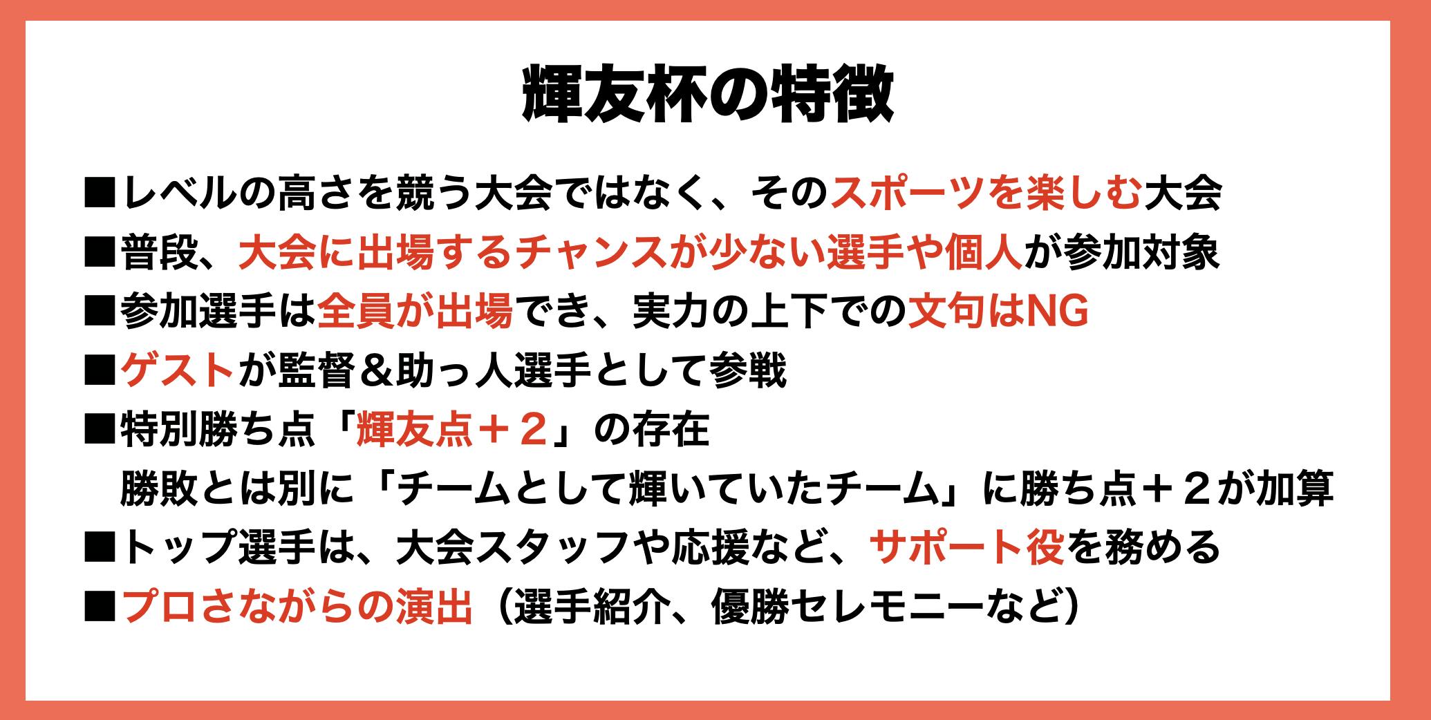 第0回輝友杯にゲストとして参加できることをとても楽しみにしてます。子供達には是非楽しんでもらいたいし、スポーツの素晴らしさを伝えていきたいと思っています。当日、皆さんにお会いできることを楽しみにしています。よろしくお願いします。