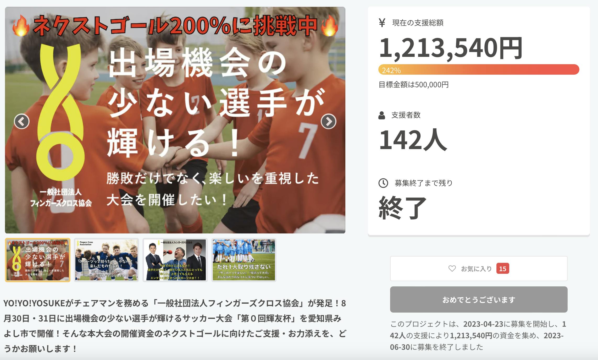 6月30日をもちまして、長きに渡りお付き合いいただきました「第0回輝友杯クラウドファンディング」も50万円目標額に対し、242%の1,213,540円でゴールすることができました!!