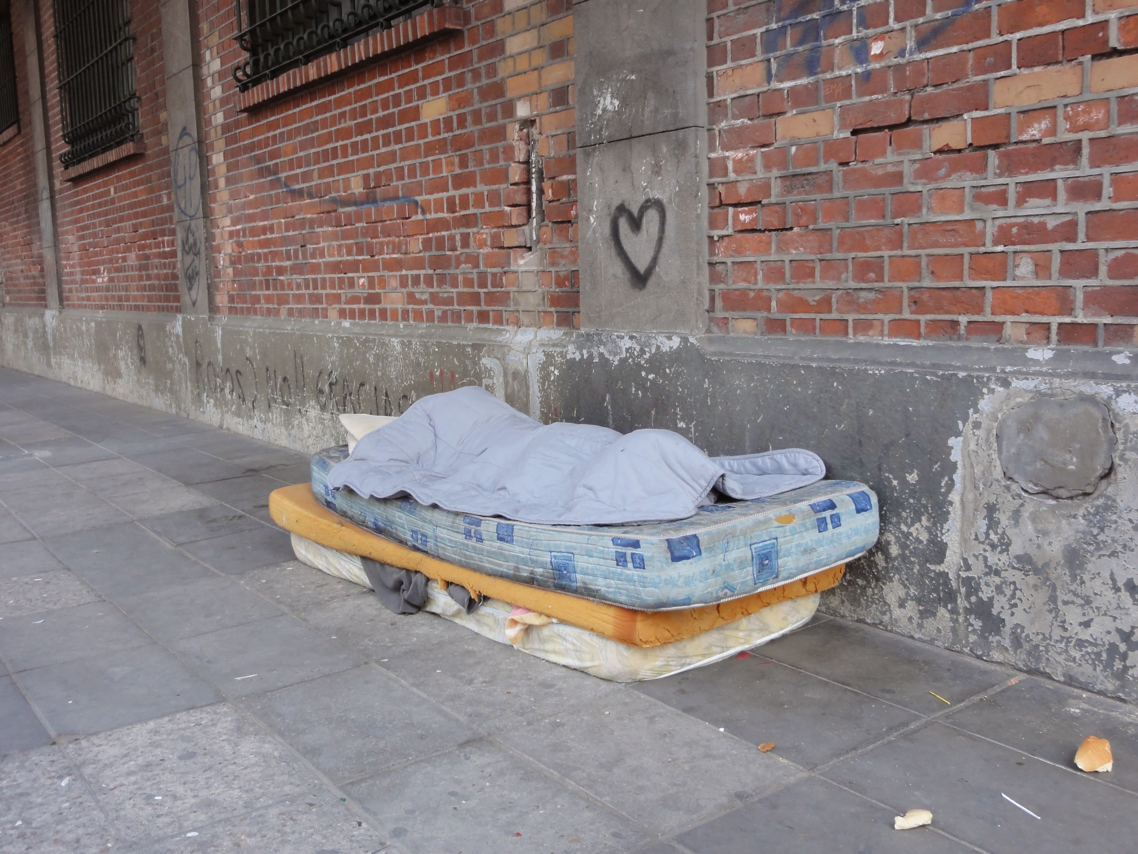 街角のマットレスで路上生活者が眠っています。通りすがりの人々が安全を気にかけたり食べ物を差し入れたり(2013年、アルゼンチン。撮影:みわよしこ)