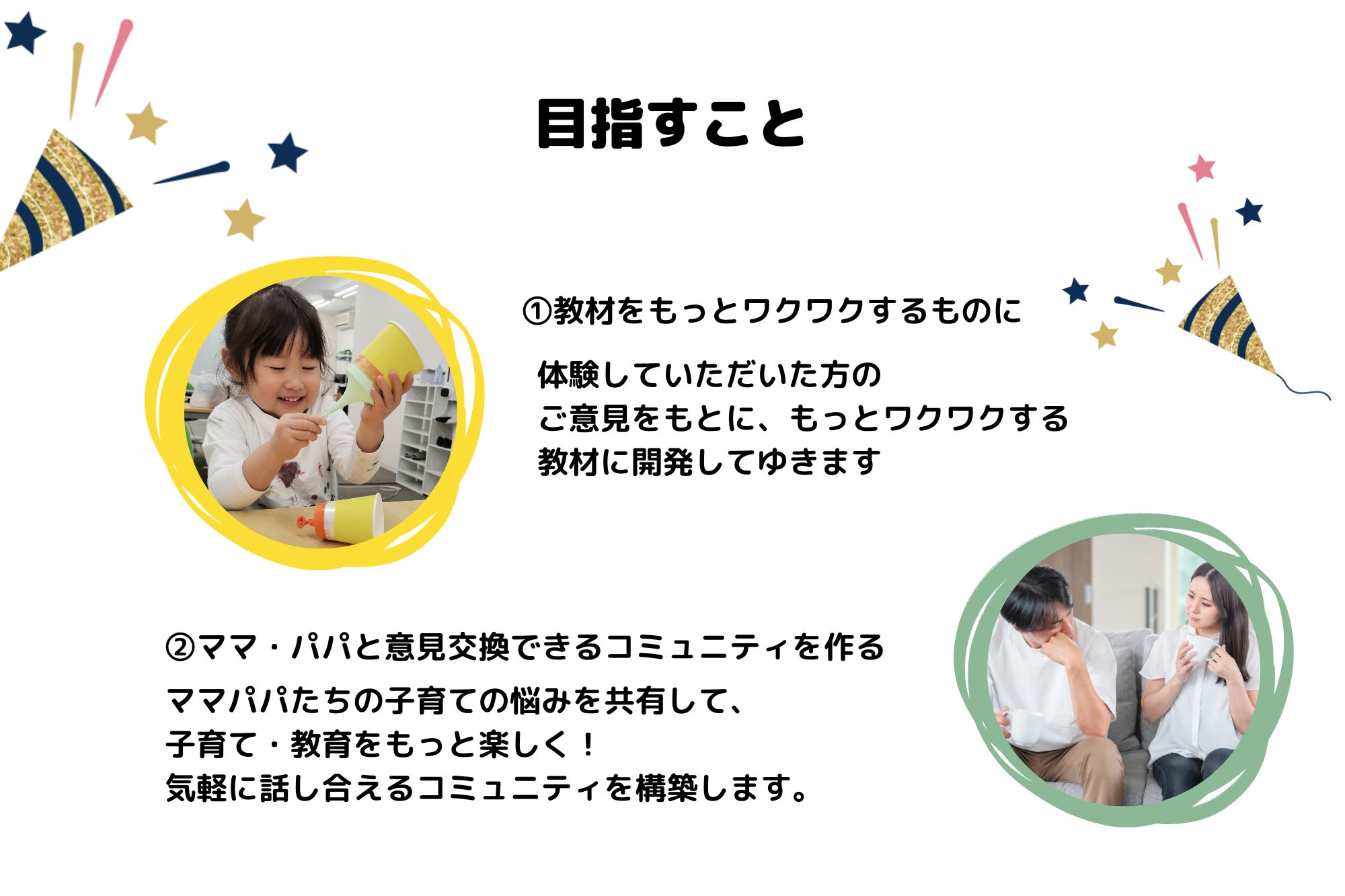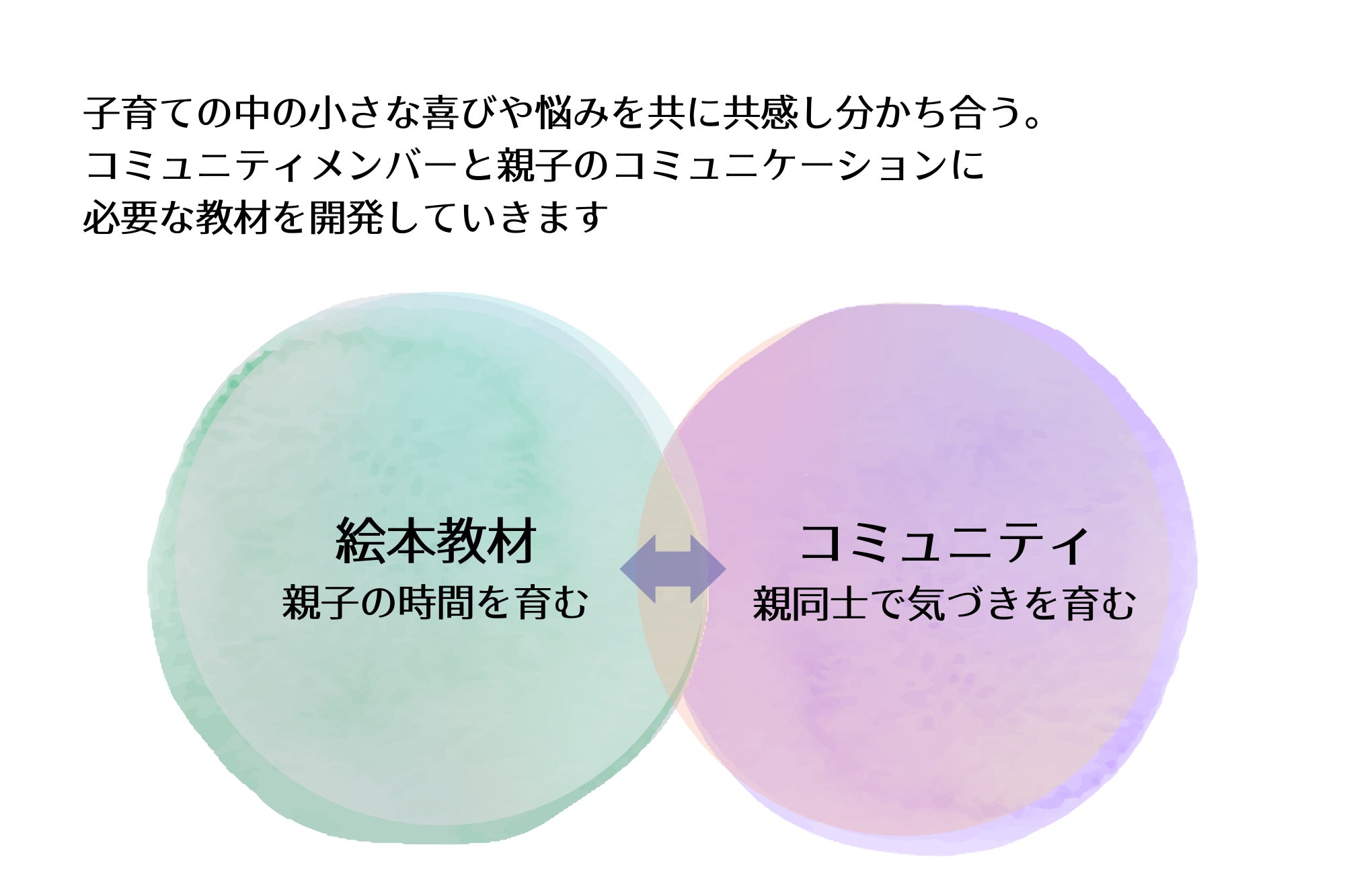 子育ての中の小さな喜びや悩みを、共に共感し、分かち合うコミュニティを築き上げたい。