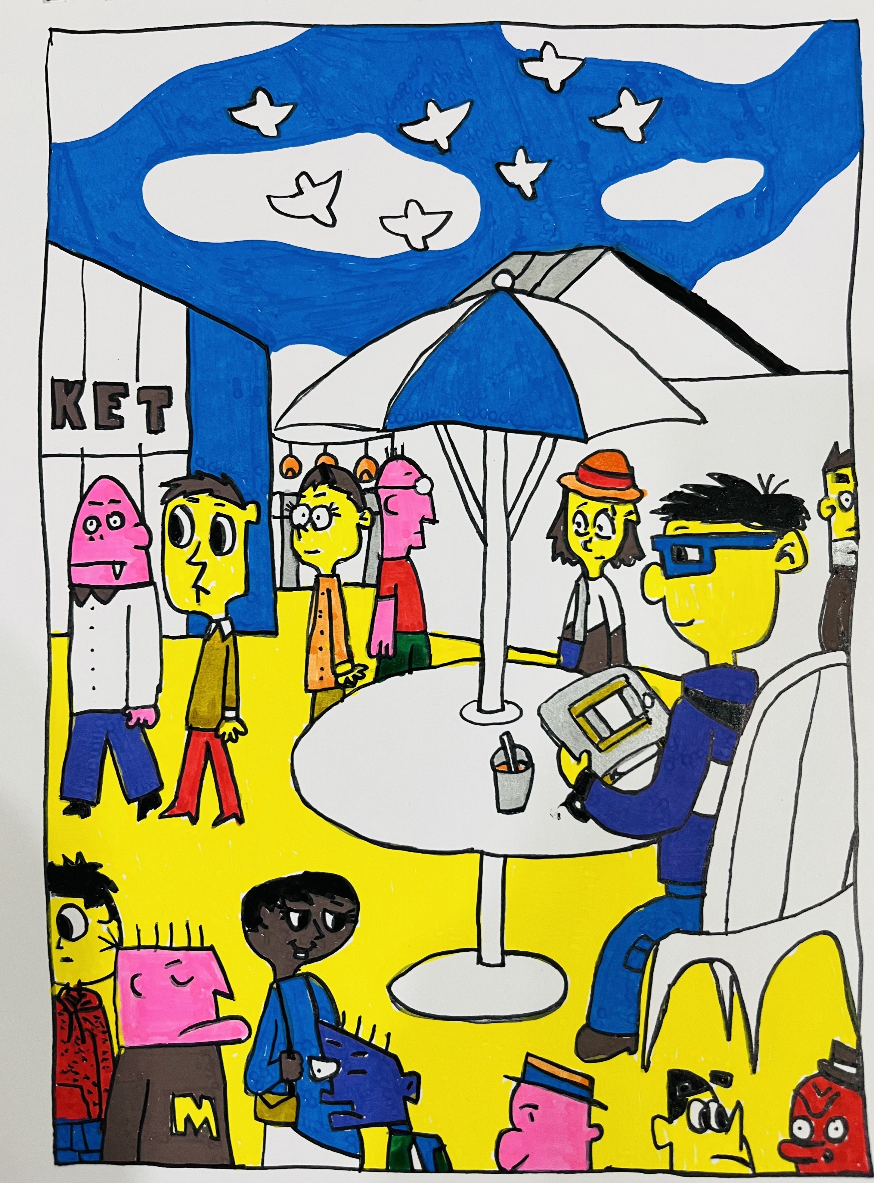 オリジナルのキャラを描いてもらいました本人をモチーフにたカートゥーン系の絵になります。いつも水彩ペンで色付けをしていましたが塗りムラがひどいのでポスカのみたいな油性ペンで色を付けてます。いつもより色の入りが良いと思います。ここから水彩ペンの使用はやめて油性ペン、絵具を使った色塗りにします。色々試した結果1番絵にあってると本人も納得してました