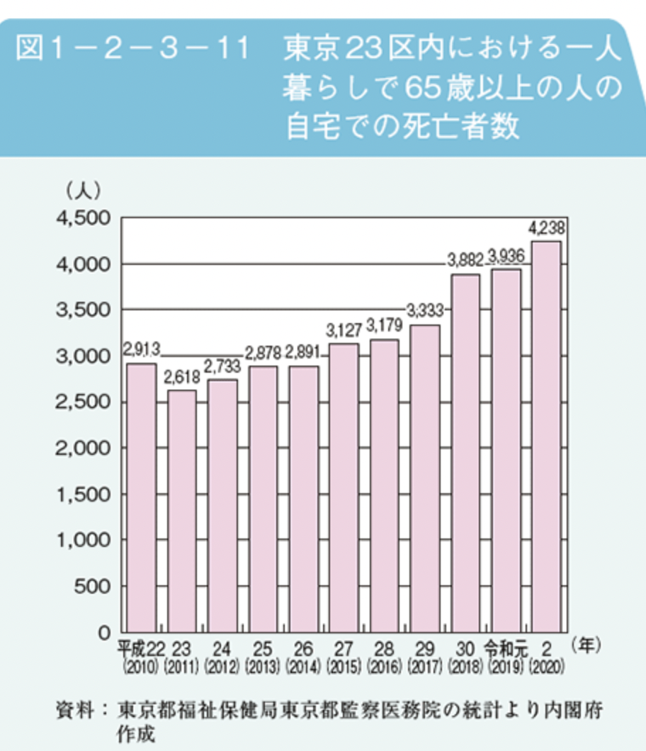 ・高齢者は20代から50代の働く世代に比べて孤独を感じている人が少ないものの、高齢者の孤立死は年々増加しています。孤立死の背景には、高齢者の1人暮らしの増加や、ご近所付き合いの希薄化など社会からの孤立が関係していると考えられています。
