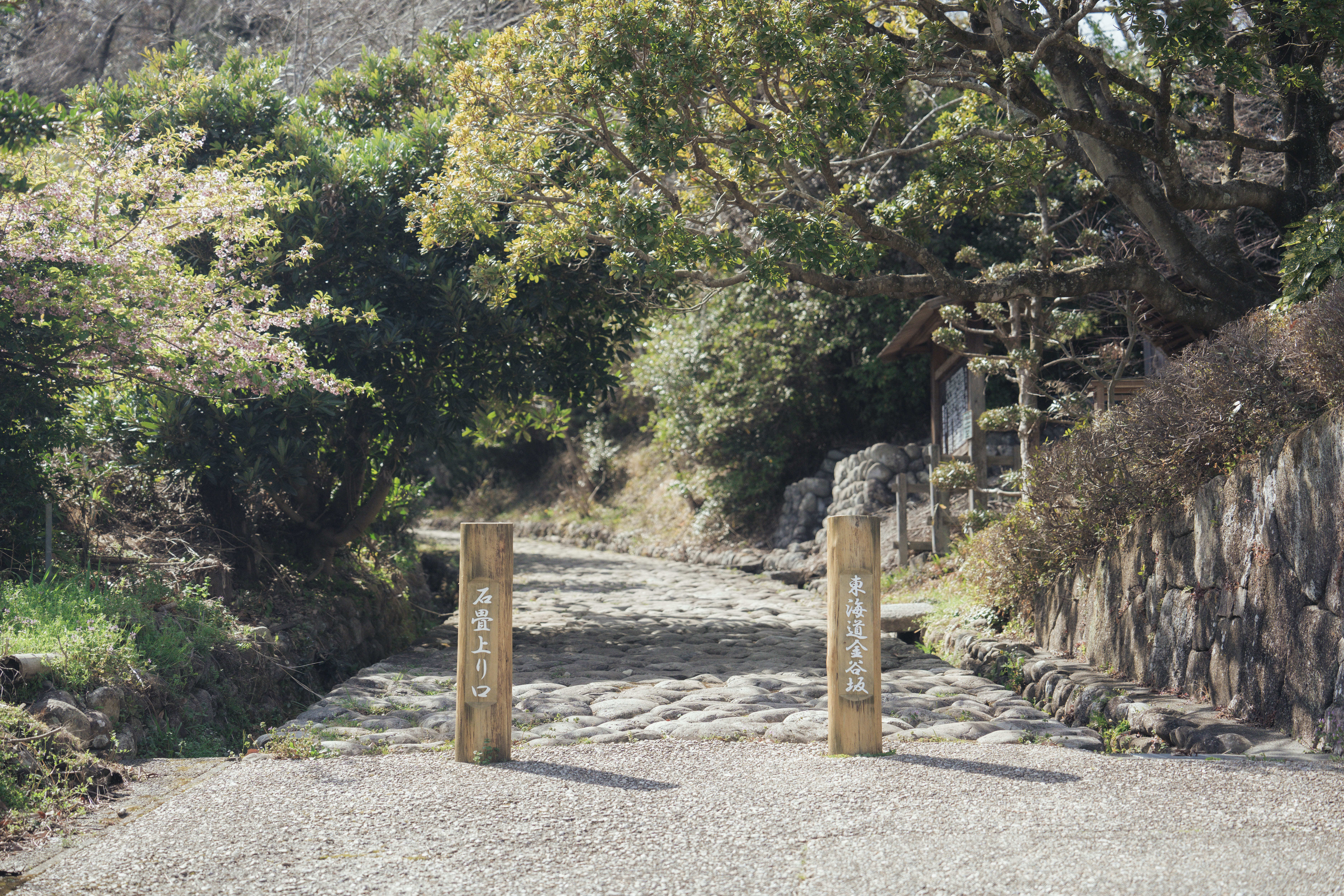 また、歴史資源も豊富で、江戸時代には東海道五十三次二十四番目の宿駅となり、大井川の川越え地点として栄えていました。菊川へ抜ける金谷坂は旧東海道の難所として知られ、当時の金谷坂は急坂なうえに「あおねば」と呼ばれる粘土層が露出しており、雨が降るとぬかるんで大名行列や旅人は大変苦労していました。そこで、江戸時代末期、約400間(約720m)の石畳が「山石」を敷き詰めて造成されました。