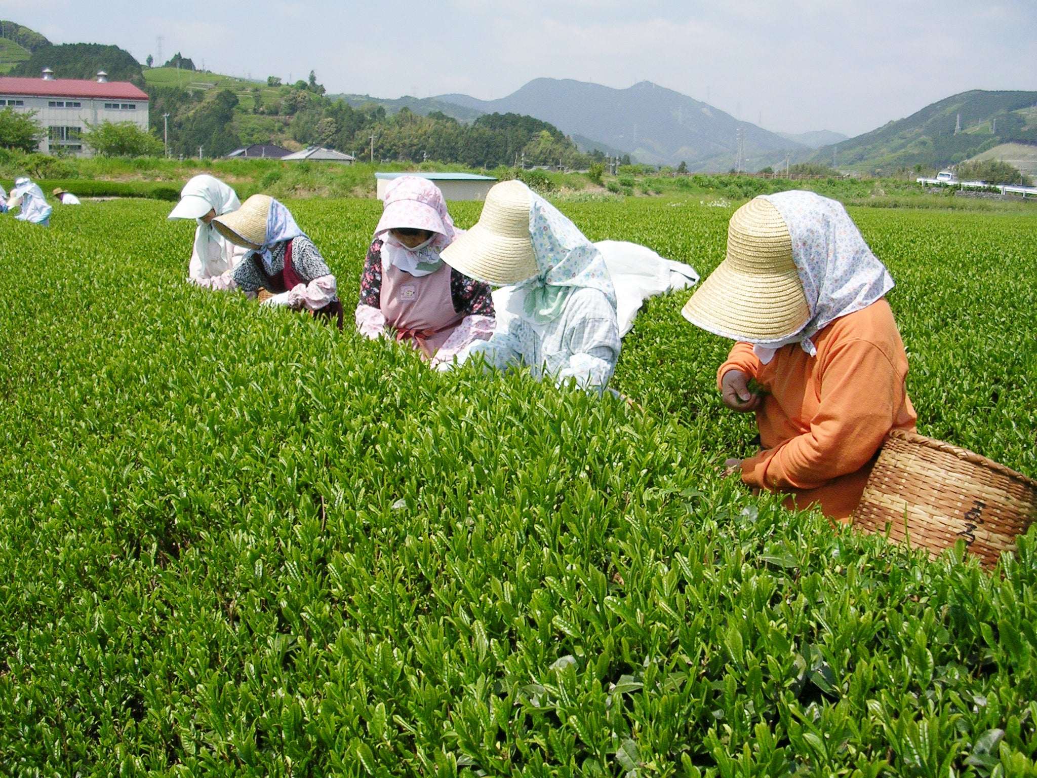 茶娘の衣装(女性限定)を着て、「金谷いぶき」の2番茶摘み取りを体験することができます。 お茶摘み後は茶工場を見学をし、「金谷いぶき」を飲んで休憩しましょう。お土産として、お茶をお持ち帰りいただけます。