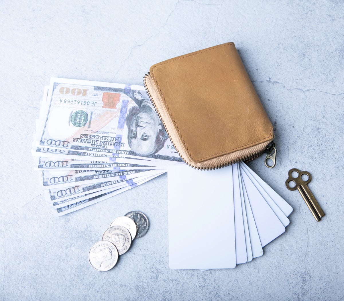<収納例>紙幣20枚・カード15枚・コイン20枚・鍵3本
