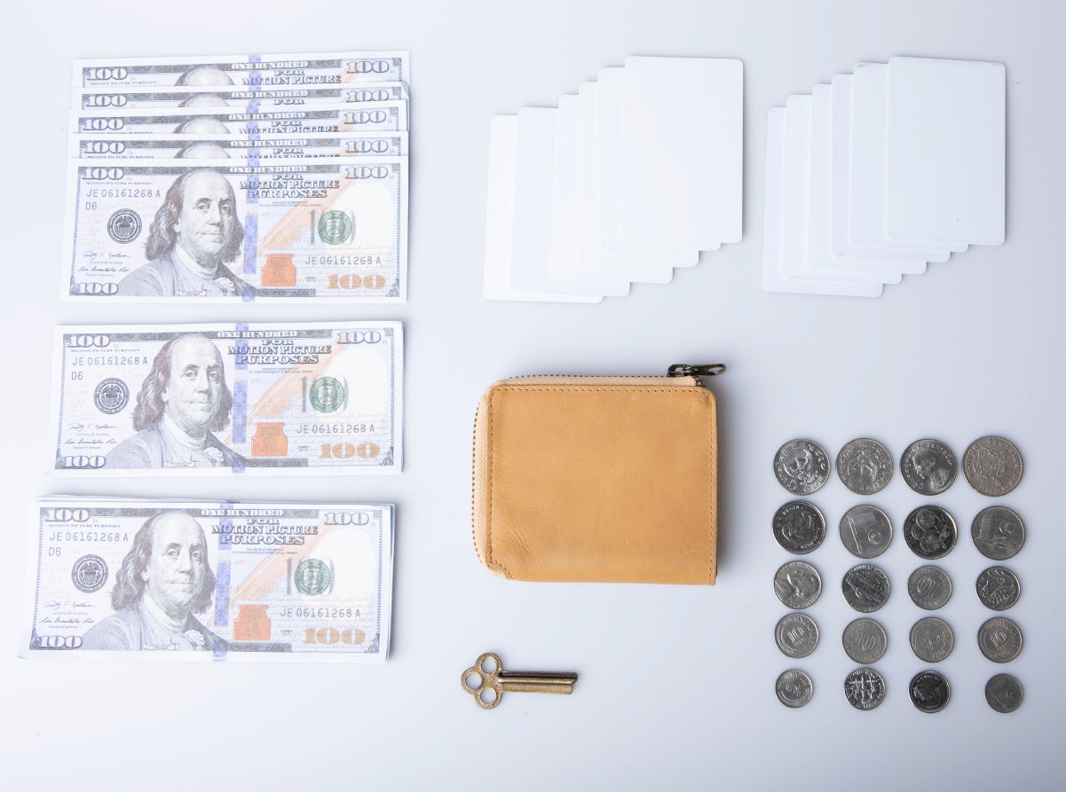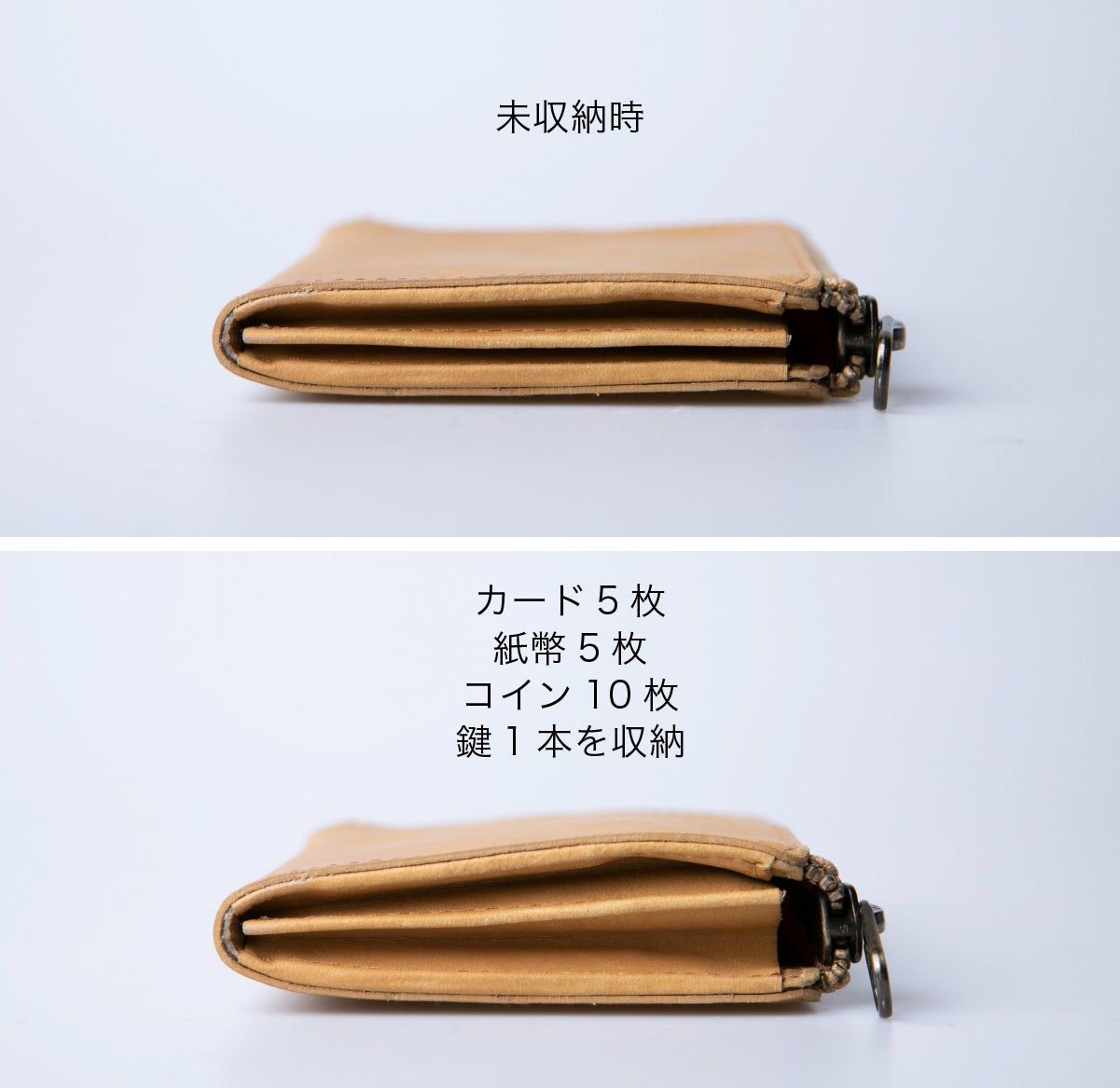 <収納例>紙幣20枚・カード15枚・コイン15枚・鍵1本