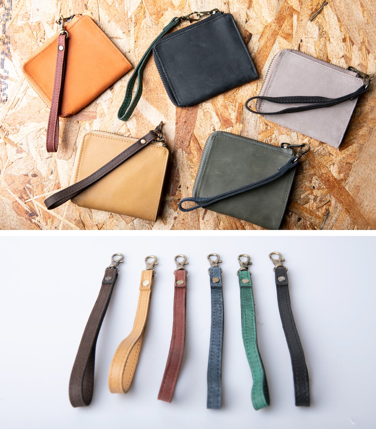 同じ革で制作したストラップを追加購入いただけます。財布の引き手部分に金具を取り付けていただき、腕に通してお使いいただけます。