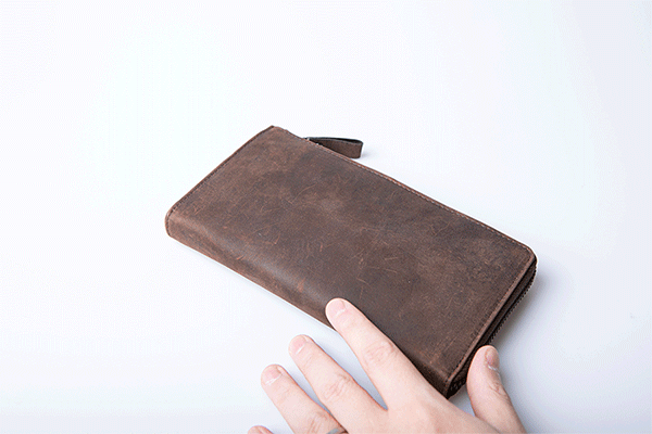 底にラウンド型に切り込みを1cm加えることで、財布を開ける際の窮屈さを解決しています。