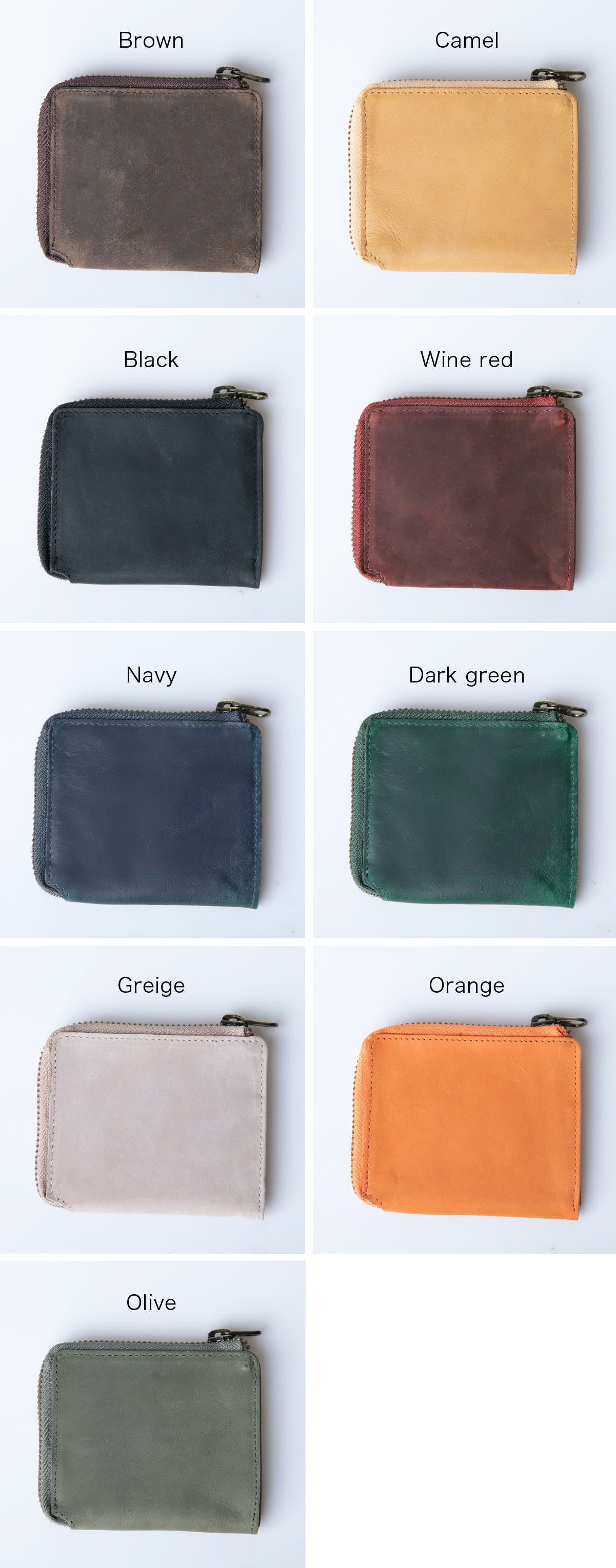 左から) Brown, Camel, Wine red,  Navy, Dark green,Black
