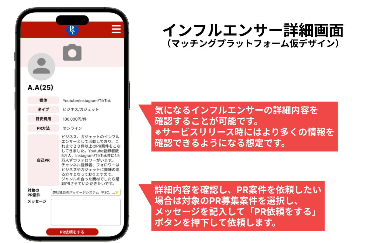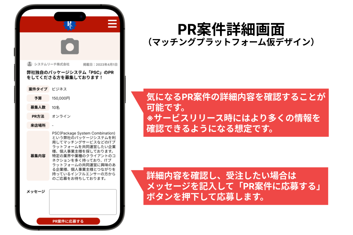 今回のプロジェクトでは、中間マージンを取らずに上記のデメリットや制約はなるべく少なくしつつも、PR案件発注者が募集を行なって発注先の比較検討ができたり、たくさんのインフルエンサーから条件を絞り込んで検索し、直接依頼する機能などの利便性はきちんと有しているマッチングプラットフォームを構築します。